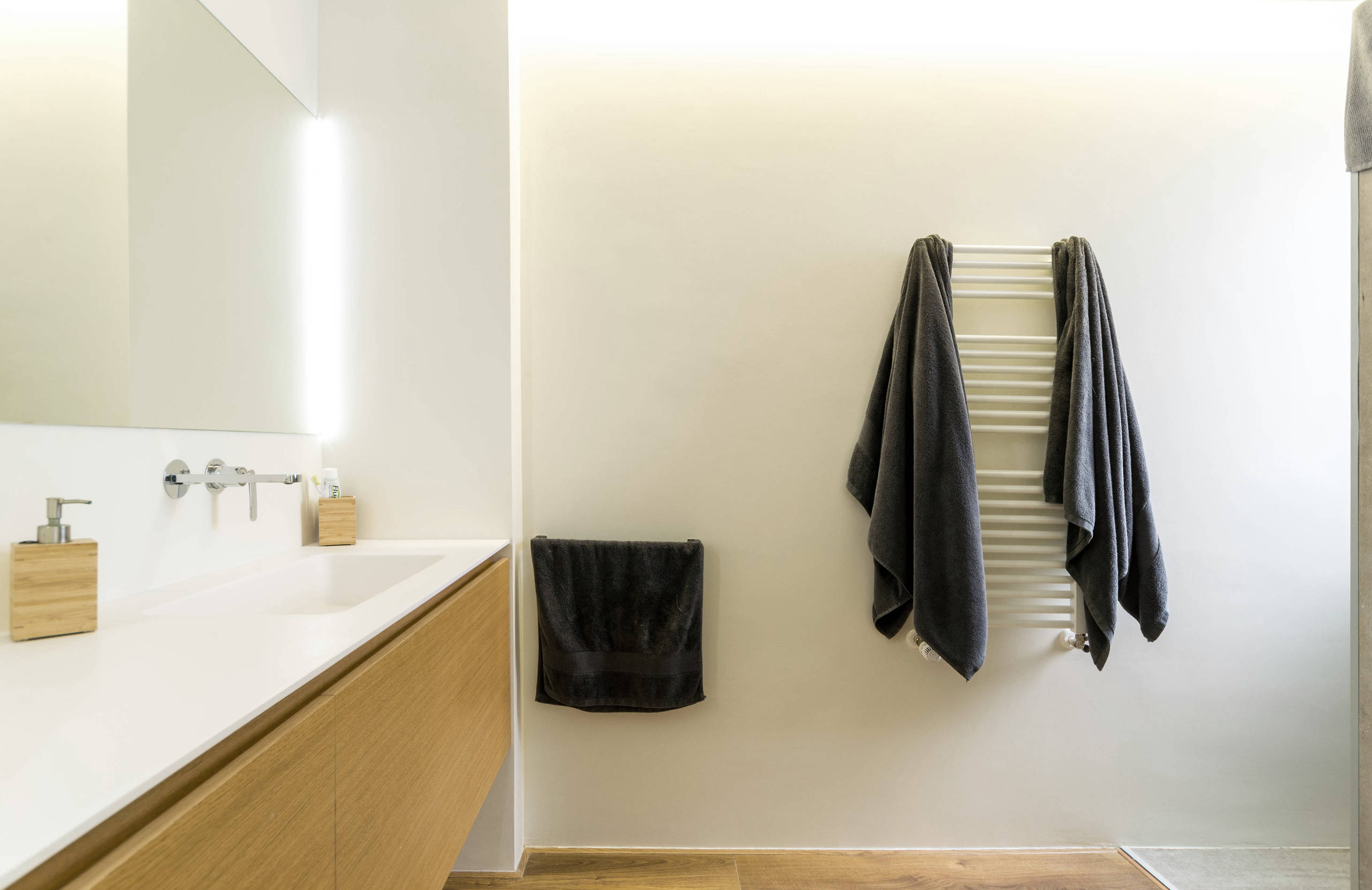 El baño de la suite sigue la lógica de la vivienda: mueble de roble, con encimera compacta, sin rebordes y con grifería empotrada, para una fácil limpieza.