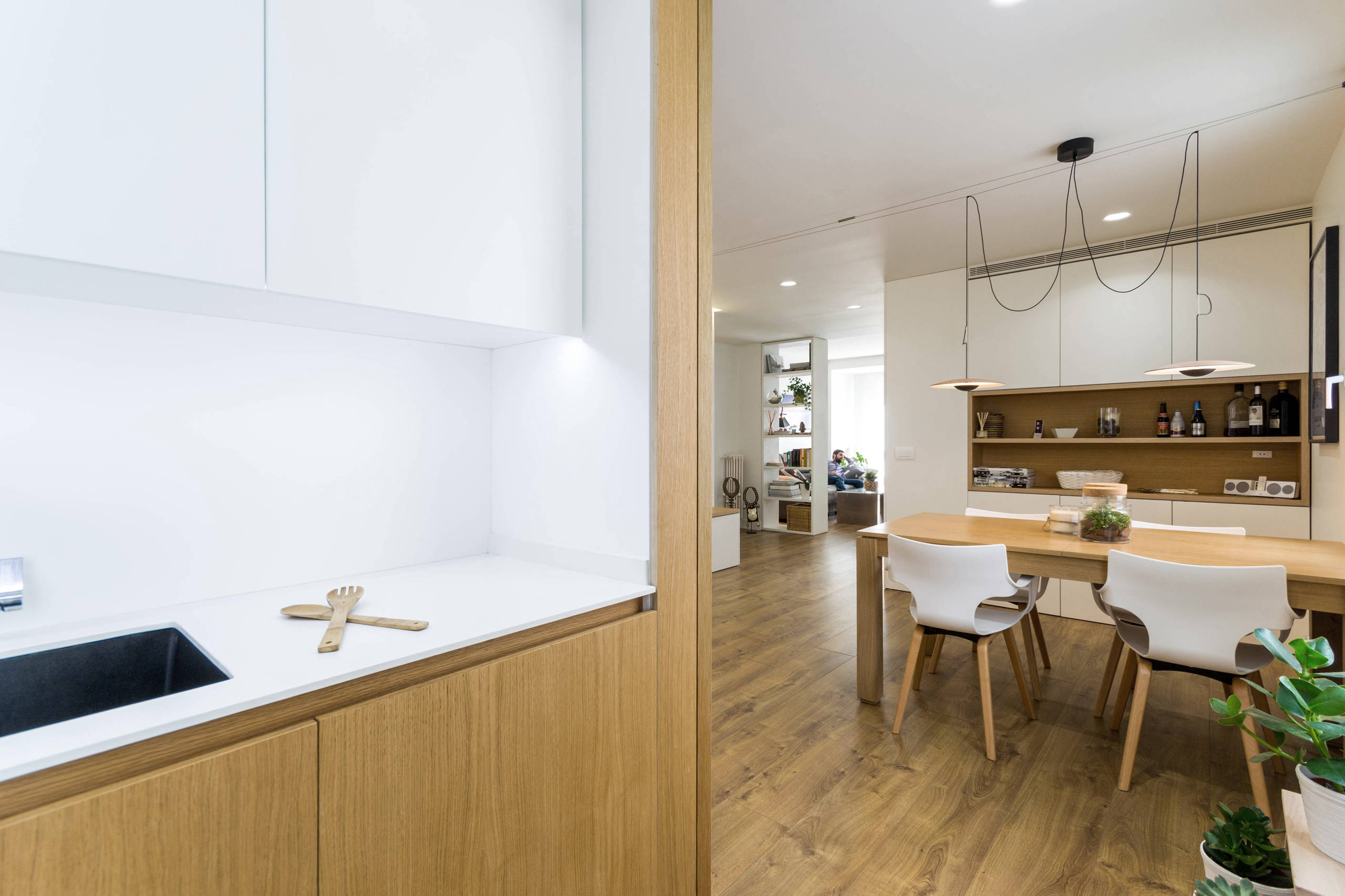 El volumen central consigue una circulación fluida en toda la zona central de la vivienda. “Desde la cocina se domina el comedor y se puede ver hasta la calle”, señala Cámara, que también apunta que en la cocina casi todo está integrado para que no quede nada a la vista.