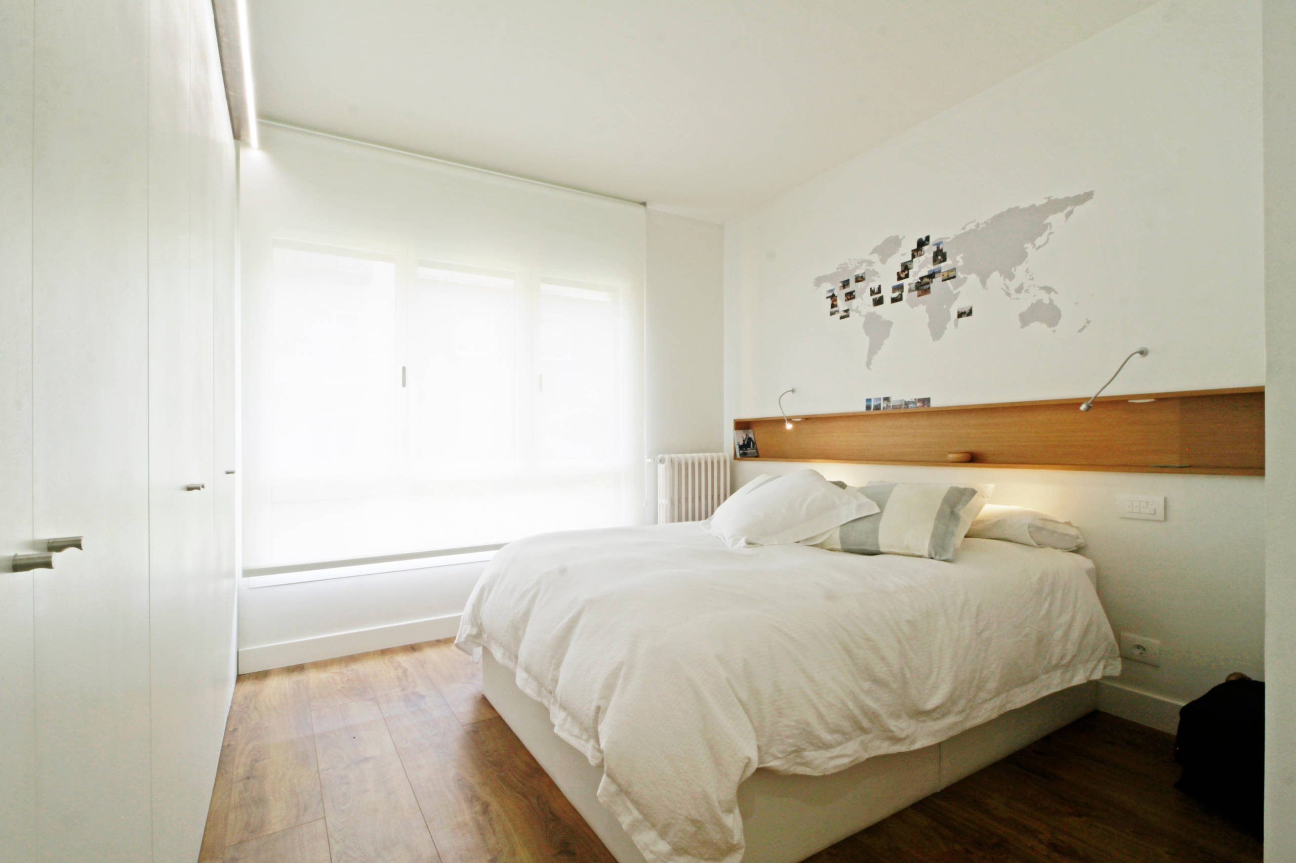 El dormitorio principal en suite se encuentra junto al salón. Minimalista, claro y despejado, el dormitorio continúa con el mismo estilo nórdico predominante en la casa, combinando mobiliario blanco, con la madera de roble natural.