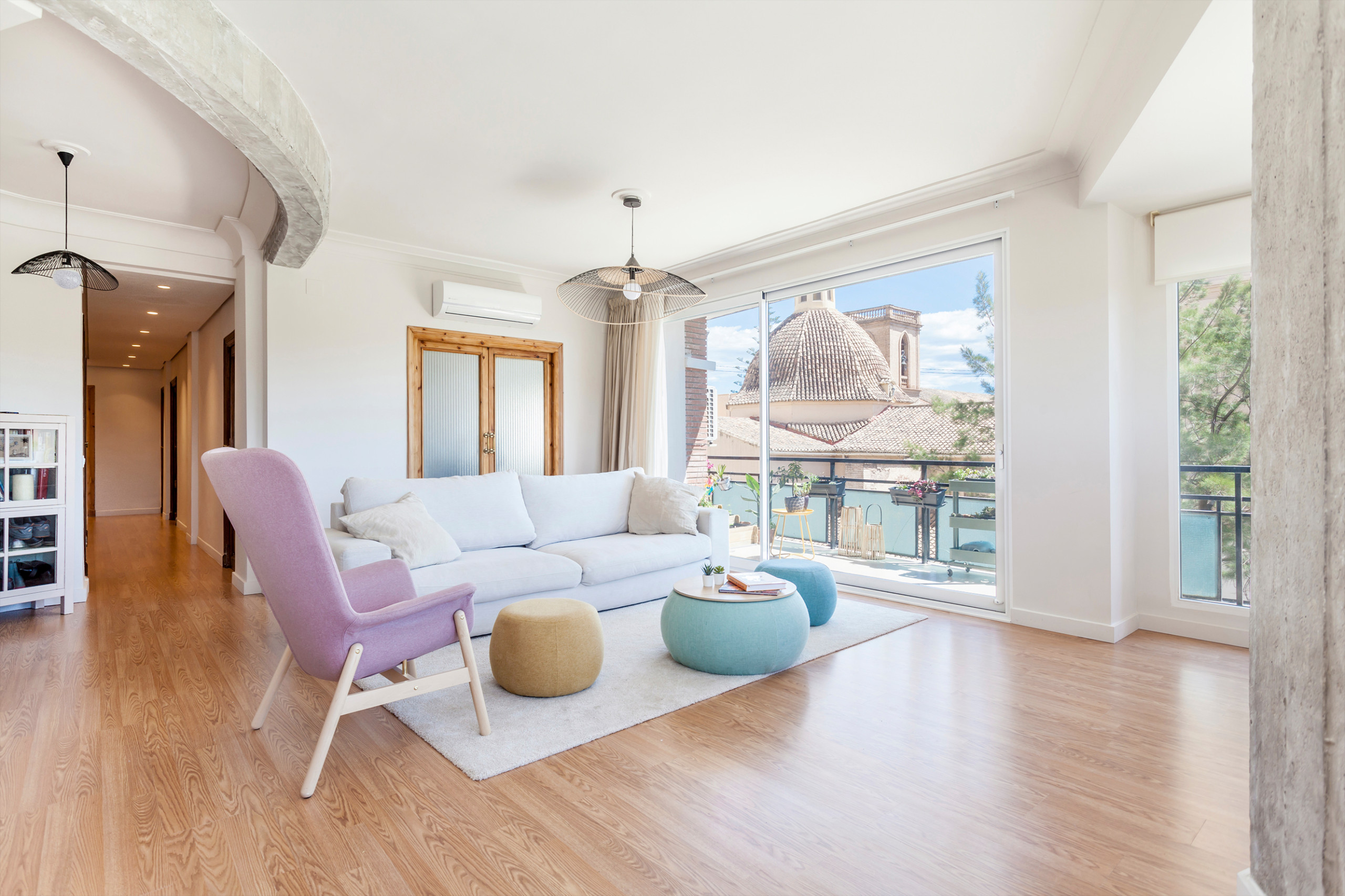 DESPUÉS: se abrieron los huecos de las ventanas para que fluyera la luz. “Ahora, el salón se ha convertido una especie de mirador. Cuando recorro el pasillo, nada más empezar, ya veo las vistas. La amplitud de las ventanas es tan grande que el antiguo cauce del río Turia y las vistas a las Torres de Serrano, el puente, la cúpula y campanario de Santa Mónica se han convertido en parte de la propia casa”, sugiere Trinidad.