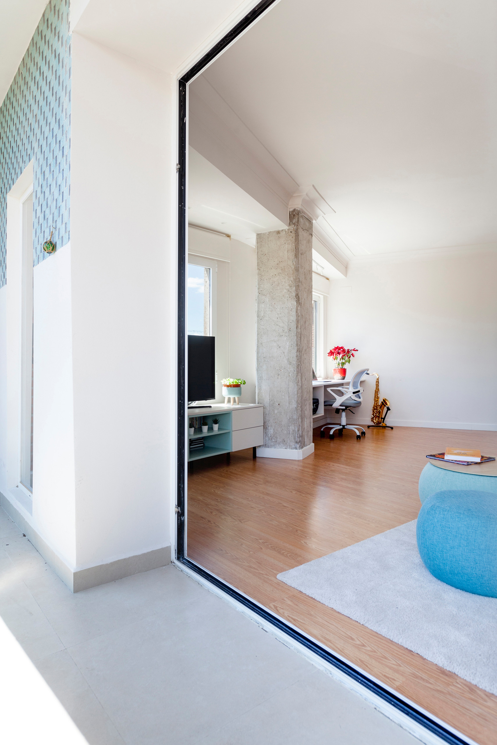 “Antes de la reforma, el espacio que tenía para trabajar en casa no me gustaba porque no me dejaba desconectar. Ahora es un único espacio, pero con vidas distintas, donde se puede ver la tele, jugar, ensayar el saxo…”, comparte Trinidad.