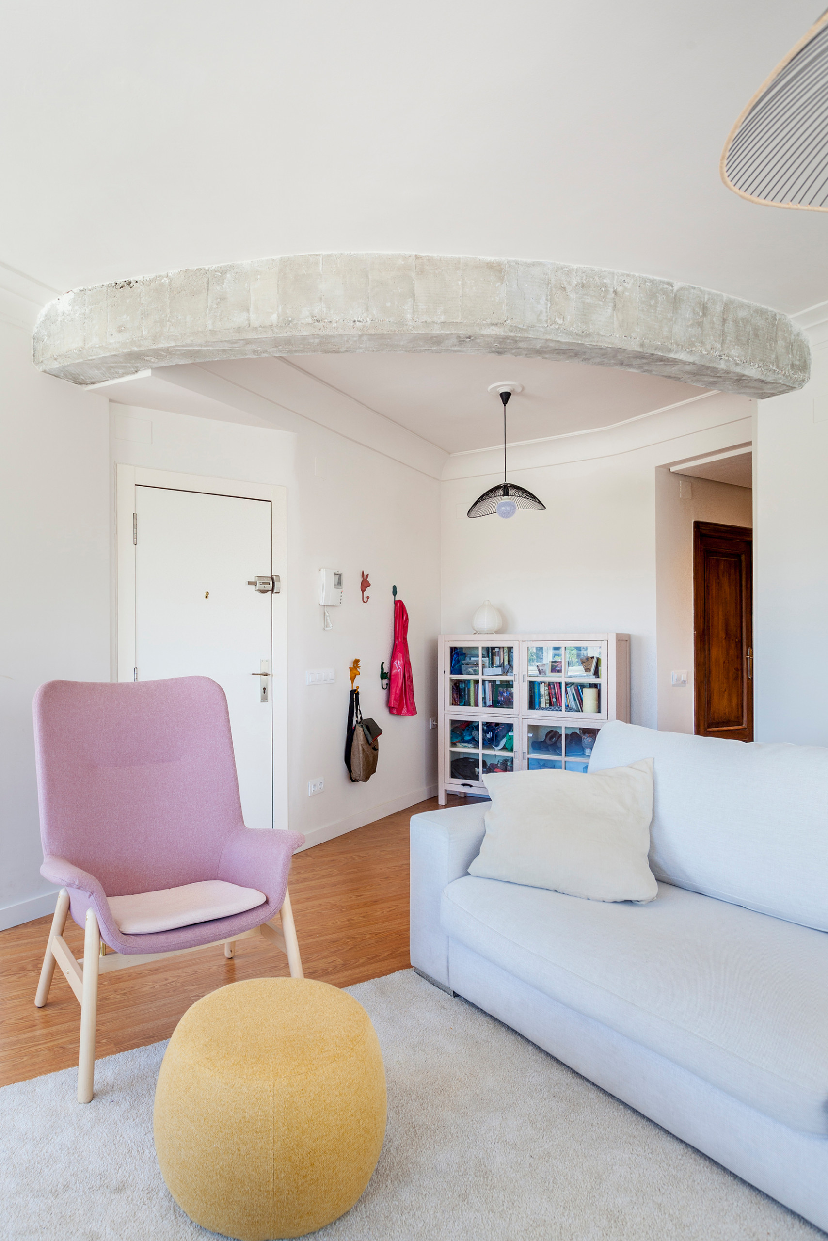 En la entrada vemos la original viga curva que antes de la reforma estaba escondida. “El elemento estético que más me gusta es esta viga circular de hormigón que evidencia los elementos de construcción curvados del edificio y que ayuda a resaltar las molduras que hemos restaurado. El hormigón me encanta y tener elementos como el gran pilar y la viga circular, o las puertas correderas a las que se le ha sacado el color de la madera natural, hace que el espacio resulte cálido y armonioso”, opina Trinidad.