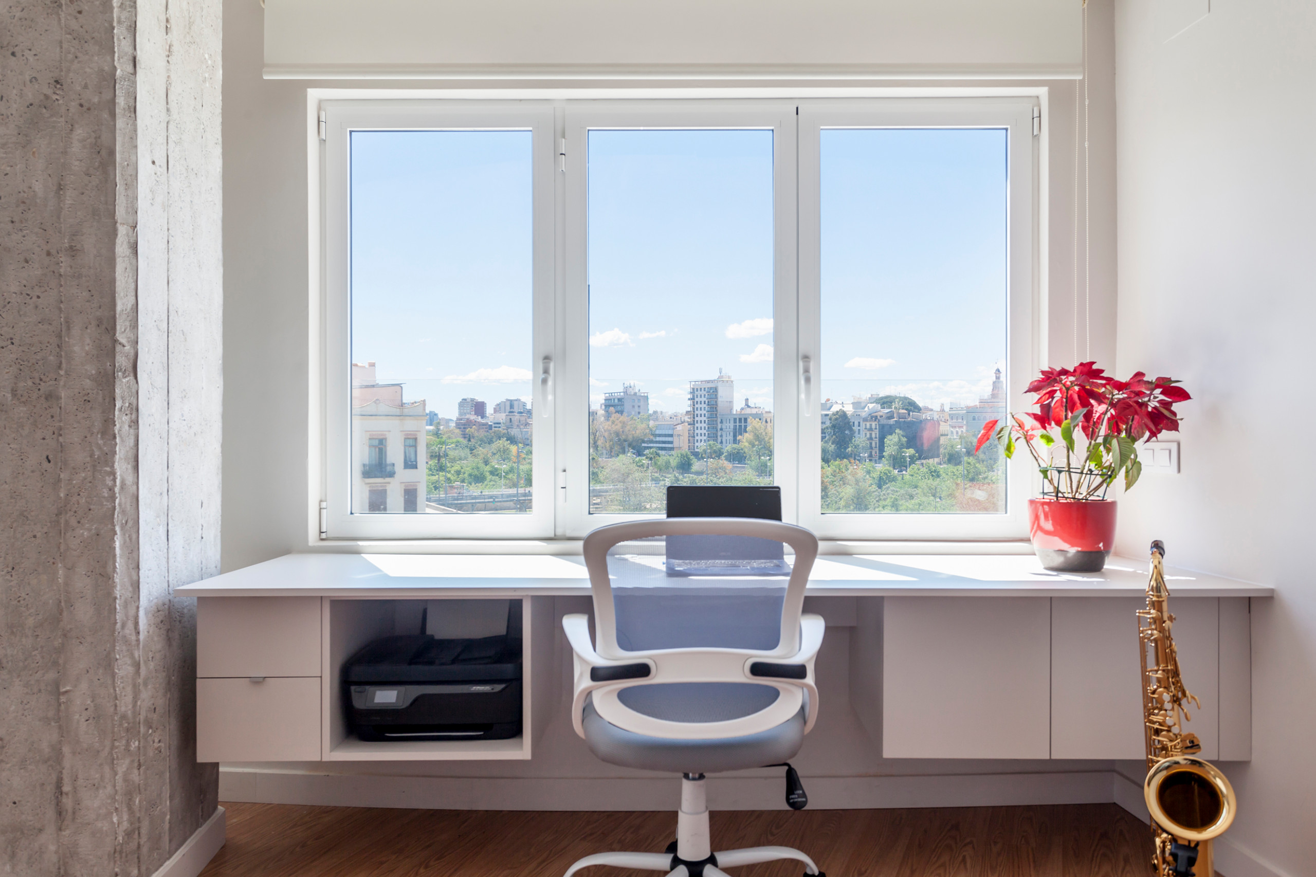 El objetivo era llenar de luz el salón y la zona de trabajo y maximizar las vistas sobre la ciudad. Trinidad, además, hizo otras peticiones. “Tenía que desaparecer el gotelé de toda la casa. Y queríamos tener una pequeña terraza que se pudiera utilizar porque la habíamos echado de menos durante el estado de alarma”, dice, añadiendo que el objetivo era “disfrutar de una casa para vivir y no para mirarla”.