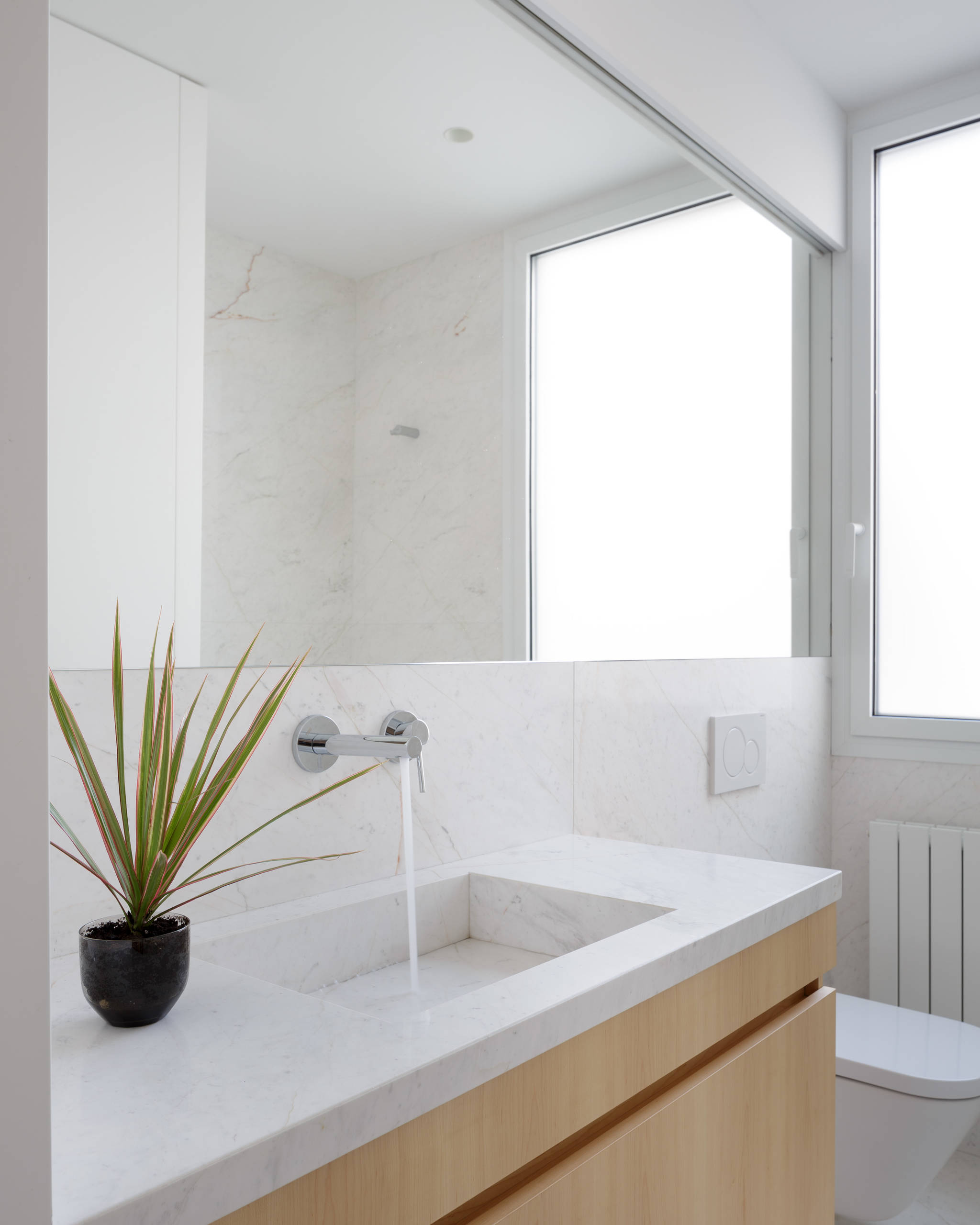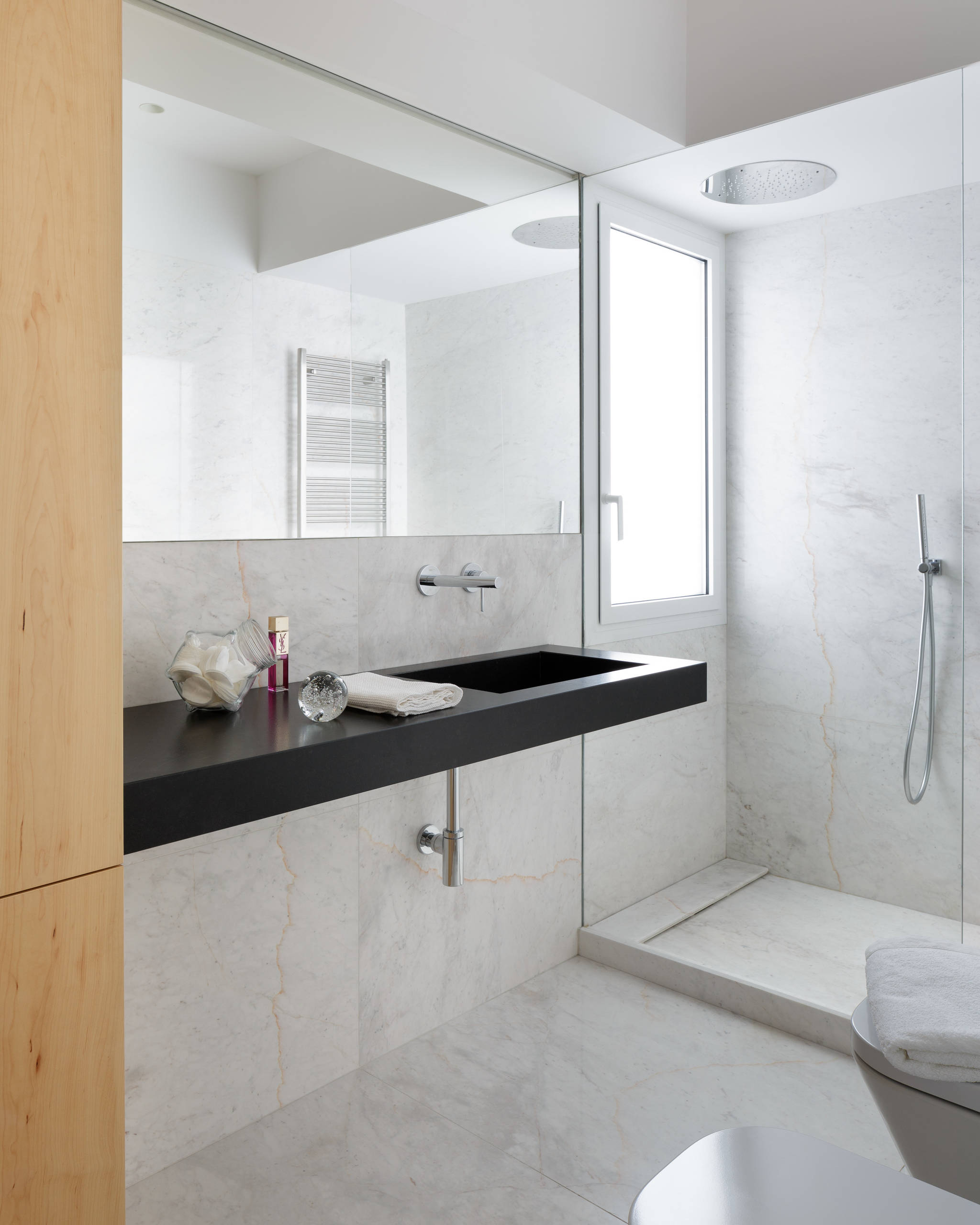 En el baño principal se apuesta por el binomio blanco-negro y para dar calidez se ha instalado un armario de madera. Suelo y paredes se han revestido con mármol –diseño y despiece realizado por Volta_. También el estudio ha diseñado el lavamanos en granito. La grifería del lavabo es el monomando mural de la serie Max-Tres de Tres; la de la ducha, monomando empotrado de la misma serie.