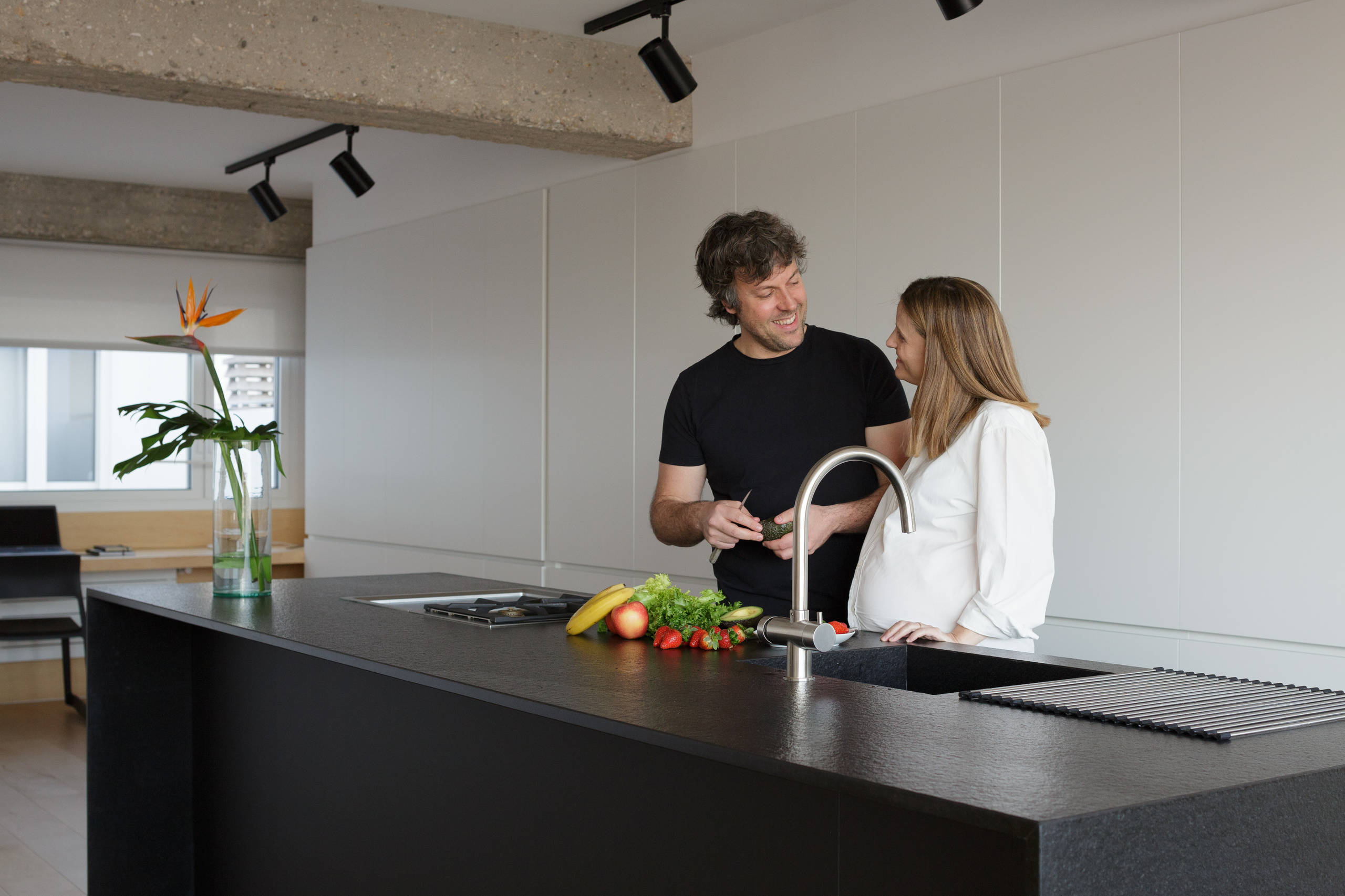 “La cocina abierta es muy práctica y, además, nos permite cocinar con luz natural y vistas al exterior. Al principio, tenía cierto recelo por los olores pero la verdad es que no tenemos ningún problema, gracias a la campana y la ventilación cruzada de la casa”, comenta Marta, en la imagen junto a Sergio.