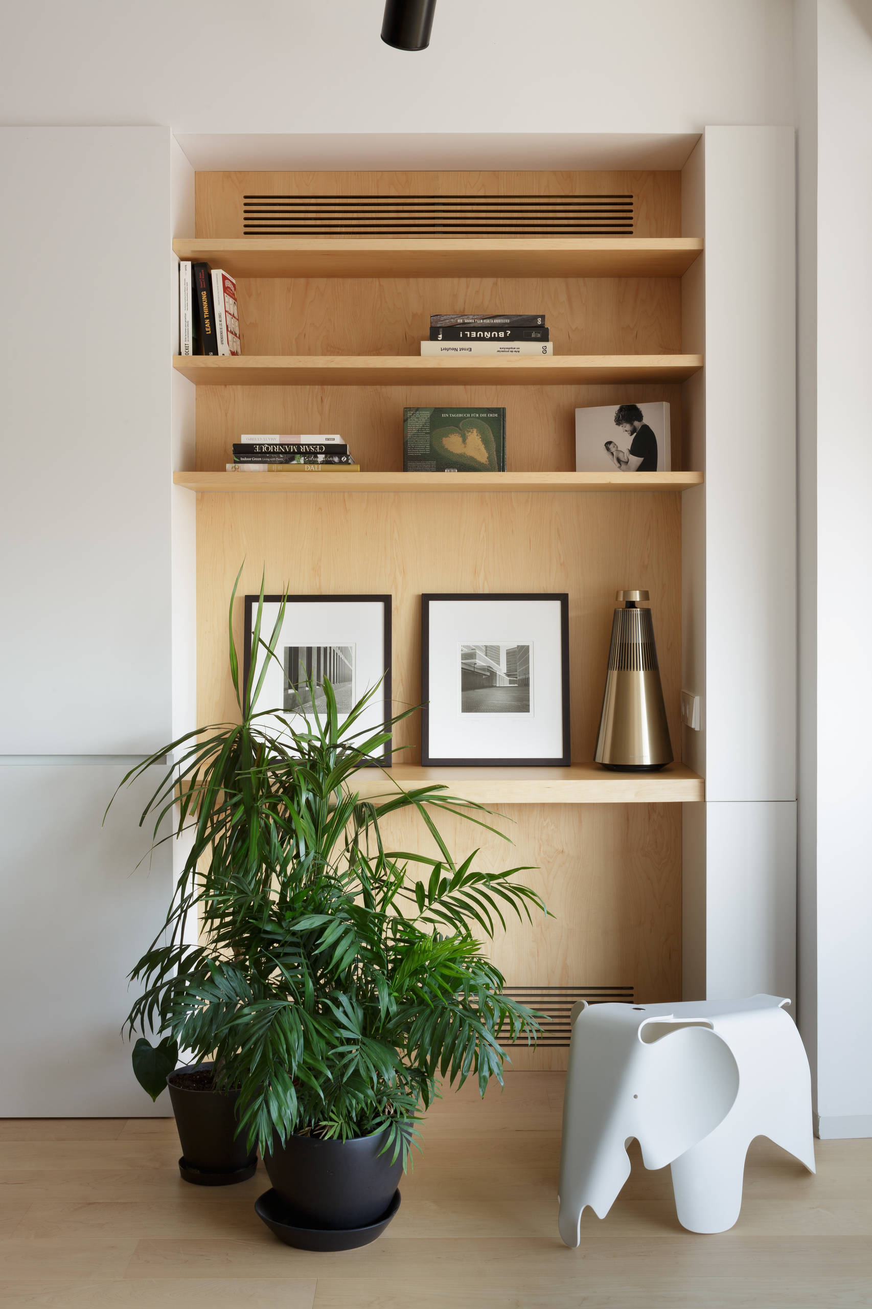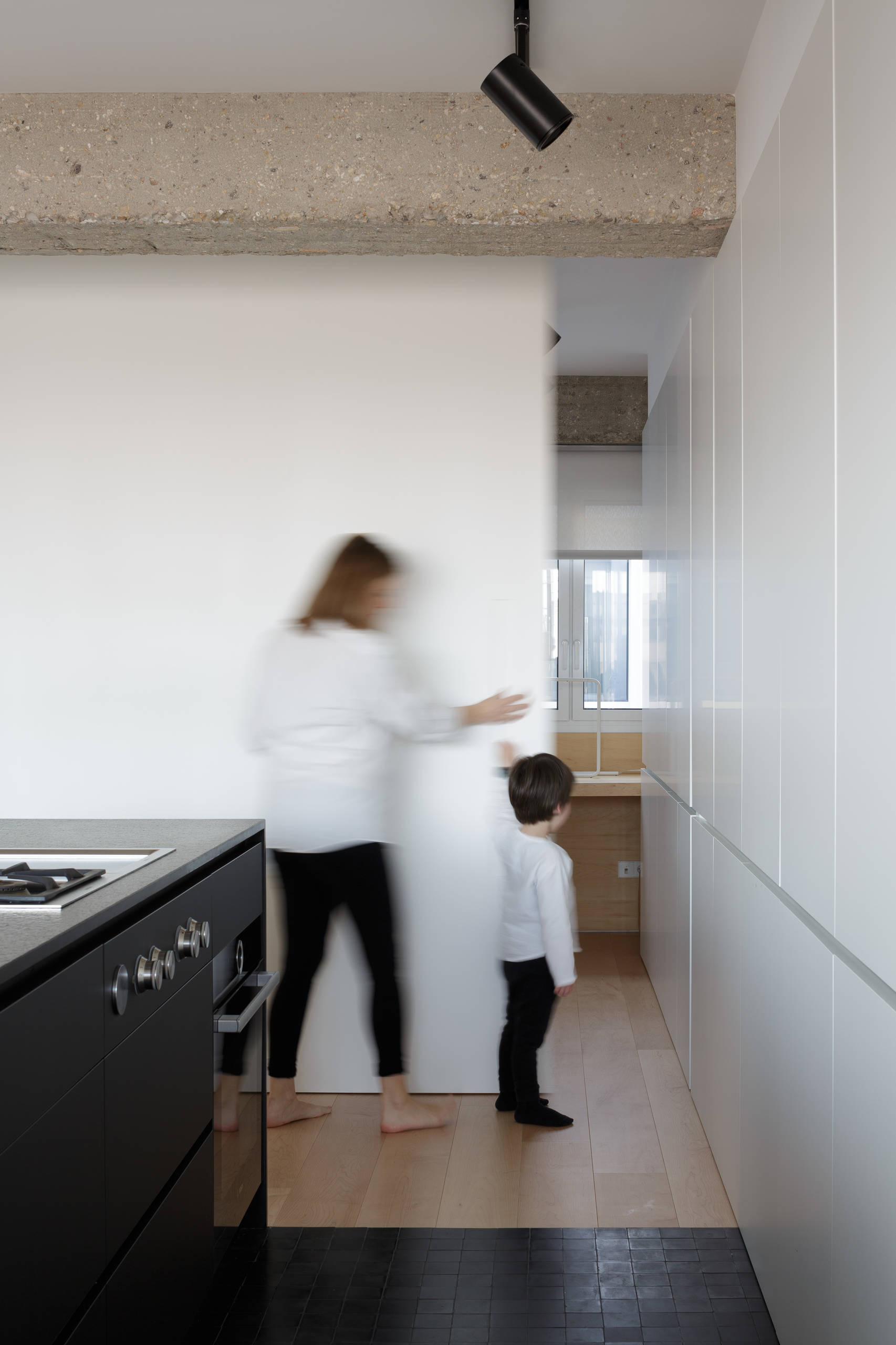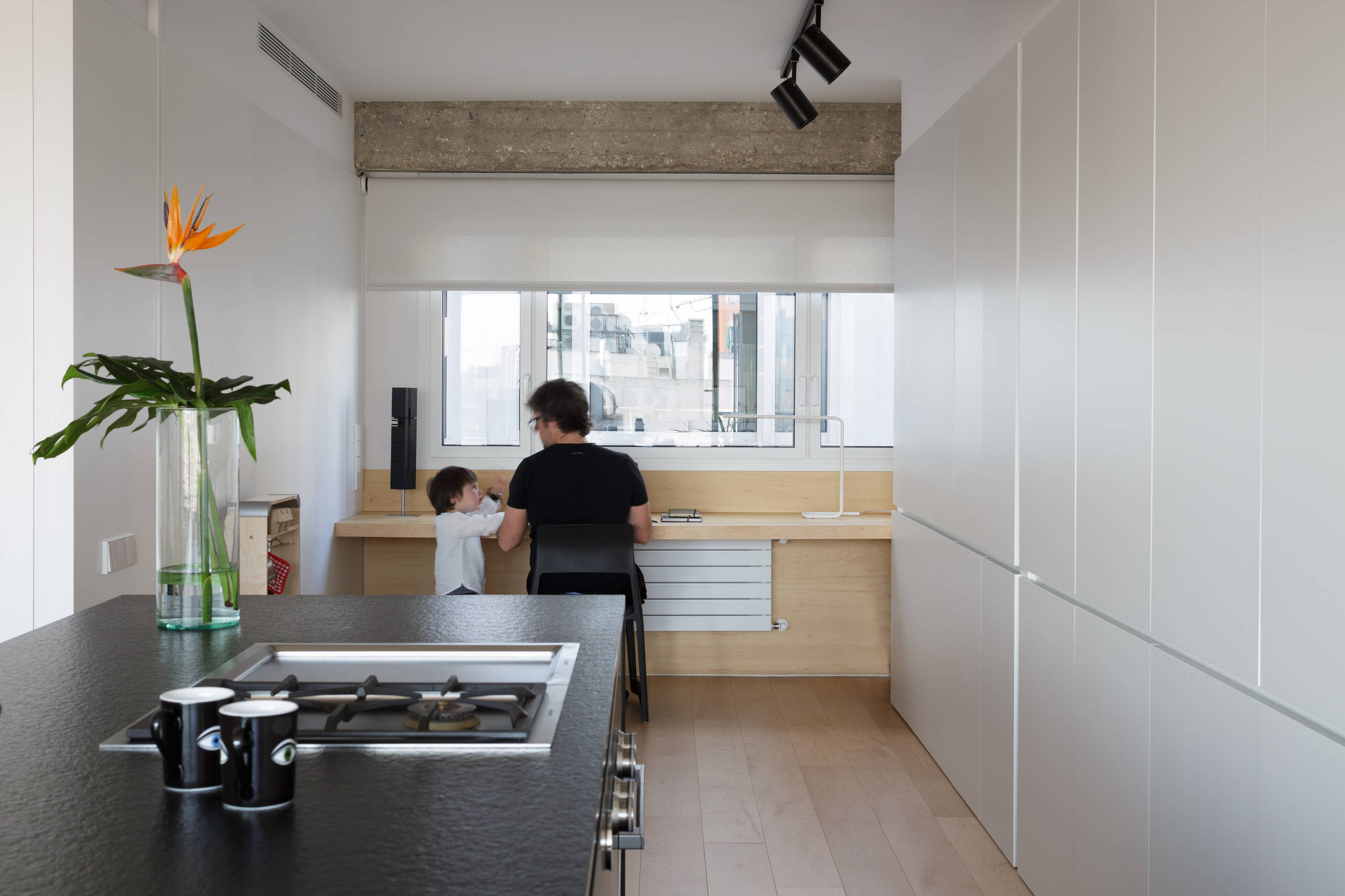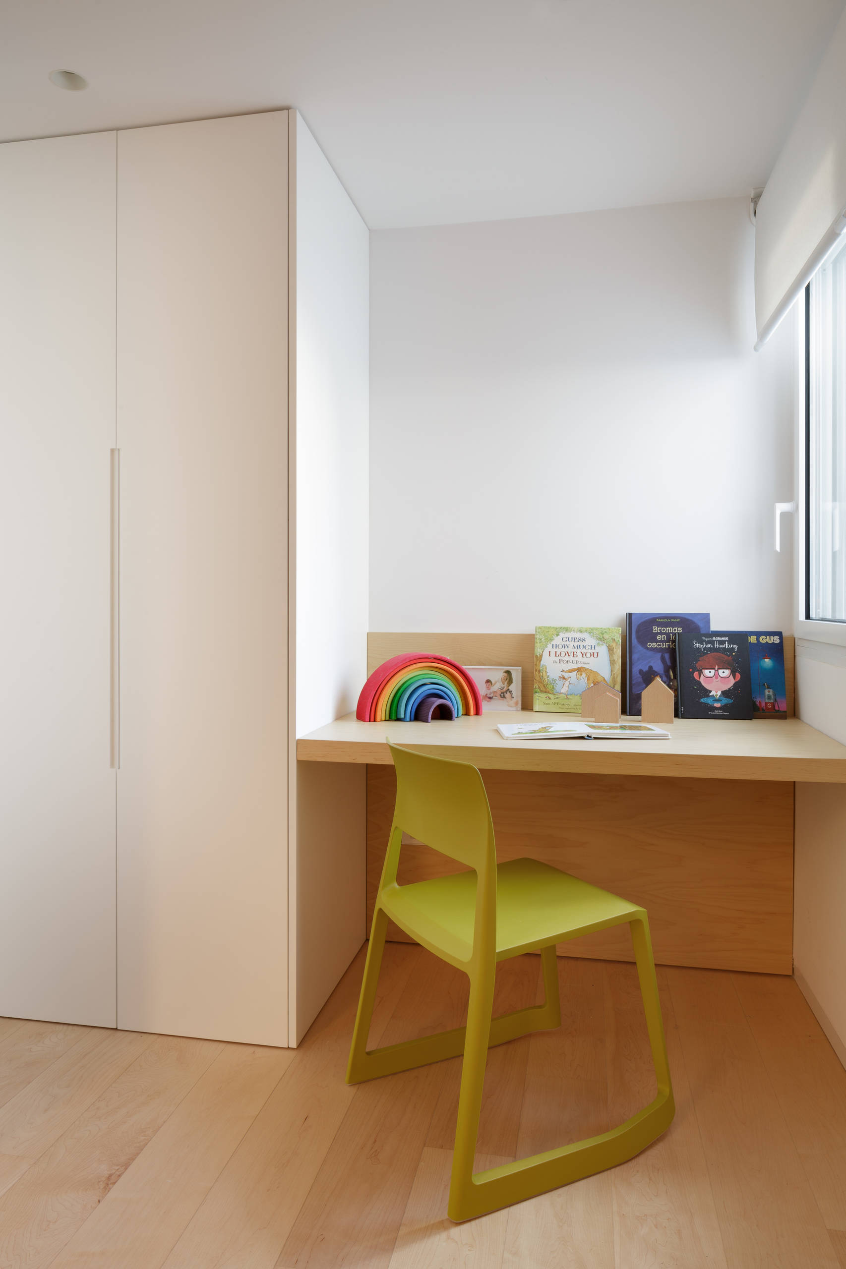 El piso destaca por un diseño depurado y estética limpia, donde la contención en la elección de materiales ha sido fundamental. El suelo es de madera de maple o de arce, material también elegido para muebles a medida como mesas, librerías y cabeceros de los dormitorios. “Hemos adquirido el hábito de caminar descalzos. Además, con Mauro nos sentamos y jugamos en el suelo”, explica el propietario. En breve, la familia se amplía con la llegada de Maia.