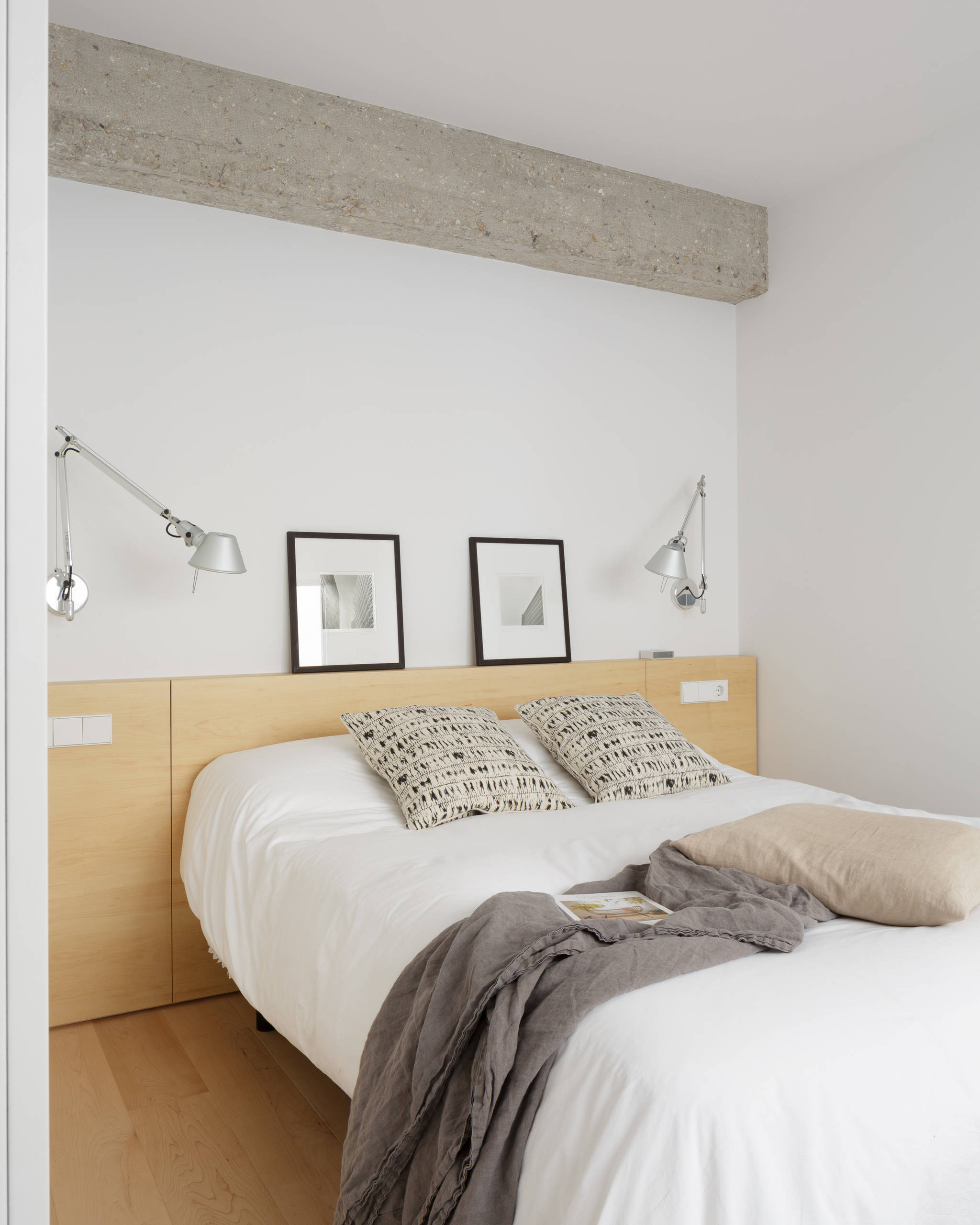 El cabecero de madera hace las veces de repisa para las fotografías de Agustín David Forner. Las lámparas son el modelo Tolomeo, de Artemide.