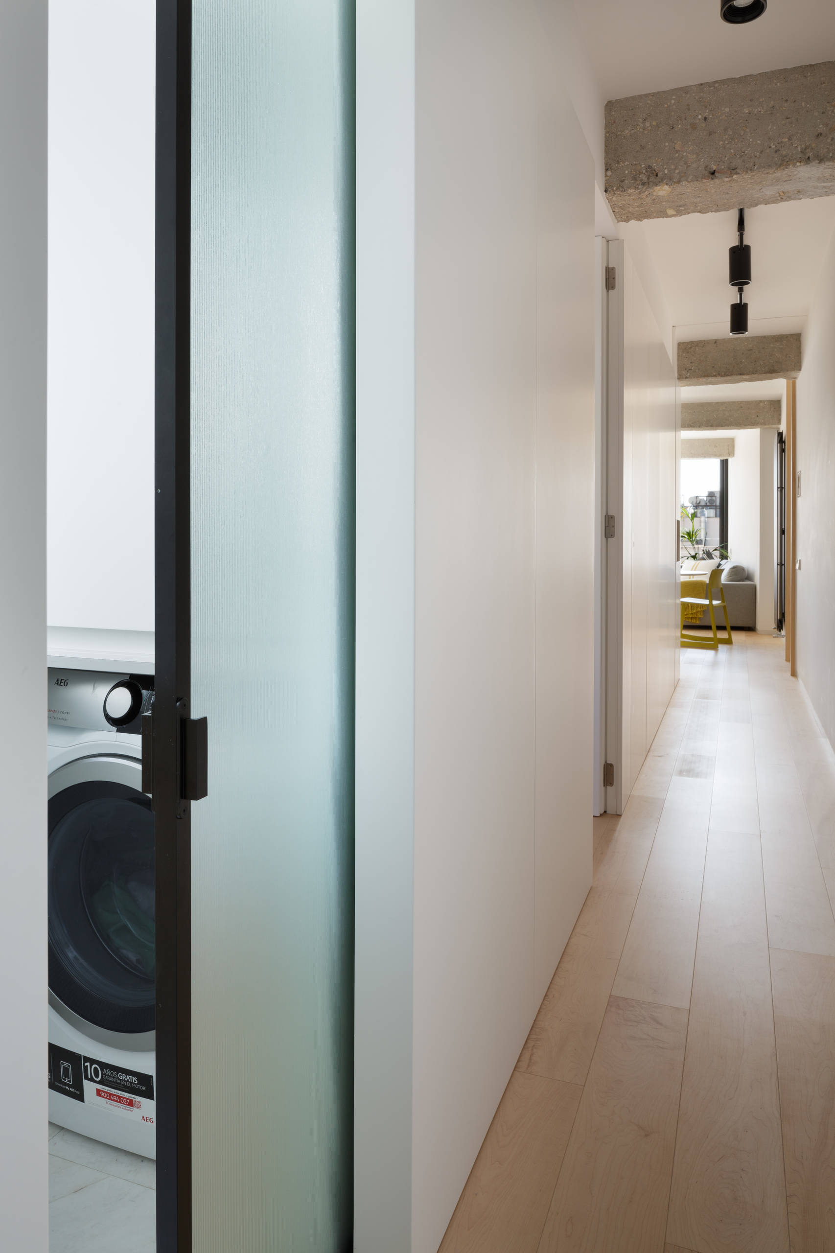 Un elemento que destaca en la vivienda son las vigas vistas abujardadas. “Estaban ocultas y las hemos dejado vistas: aportan personalidad a la casa y compensan la atmósfera tan neutra. Además, acompañan en el recorrido y marcan el paso”, explica el arquitecto.