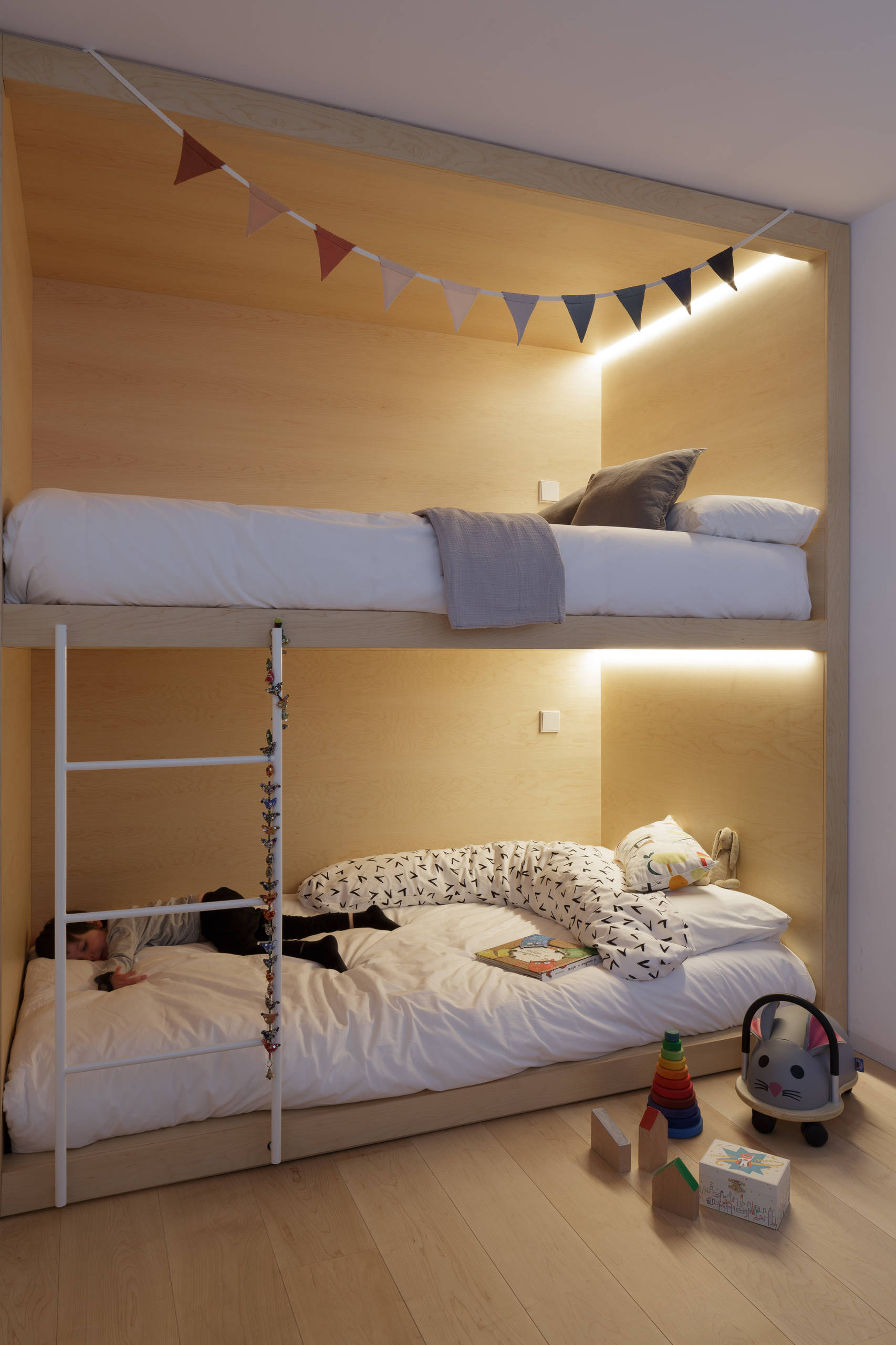 En el dormitorio infantil, Volta_ ha diseñado una litera a medida en madera de arce, forrando la estructura metálica.
