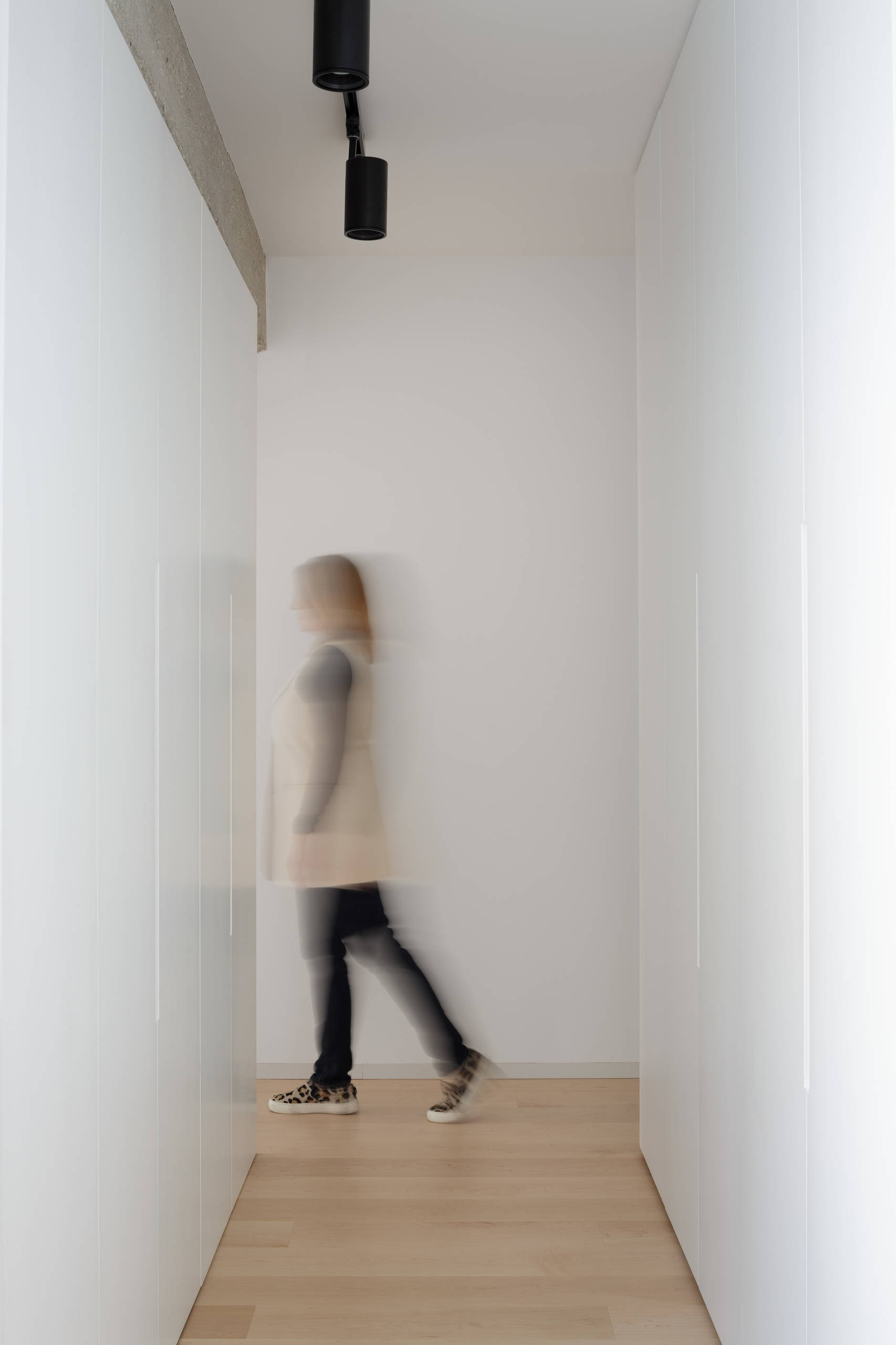 Una de las características más destacadas del proyecto son los paneles de las paredes realizados en DM con laca blanca mate. En ellos se ocultan armarios y, en algunas zonas, puertas correderas para delimitar áreas e independizar espacios. Las puertas quedan perfectamente ocultas.