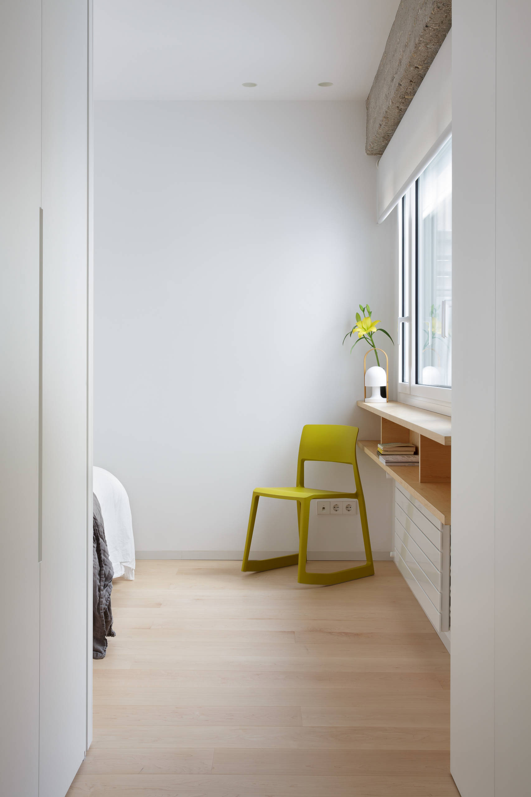 La zona inferior de la ventana se aprovecha con un mueble a medida. La lámpara es el modelo Follow Me, de Marset, diseño de Inma Bermúdez. Los estores screens blancos de toda la vivienda son de Bandalux.