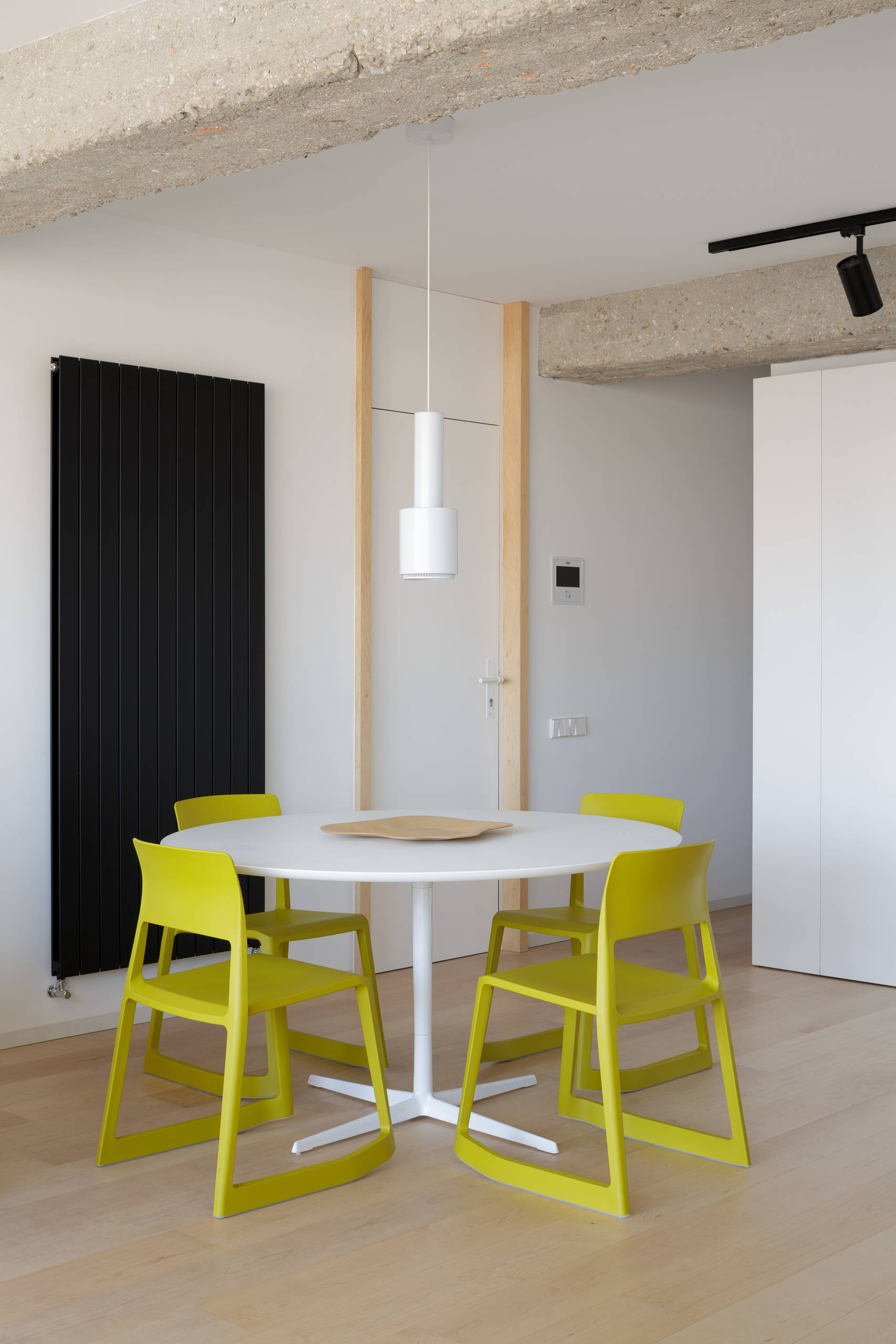 El comedor es minimalista y funcional. La mesa es el modelo Eolo de Arper; las sillas son el modelo Tip Ton de Vitra, diseñadas por Edward Barber & Jay Osgerby. Para iluminar, se ha instalado la lámpara de techo A110 –más conocida como Hand Grenade–, de Artek, diseñada por Alvar Aalto en 1952.