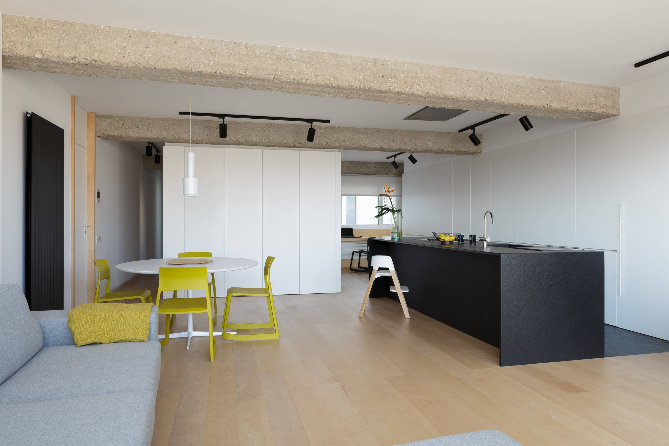 En la cocina, la pieza más destacada es la isla de granito en negro, color usado también para focos y radiadores de la zona de día, así como el suelo: un pavimento hidráulico. La isla tiene el fregadero integrado diseñado por Volta_ .