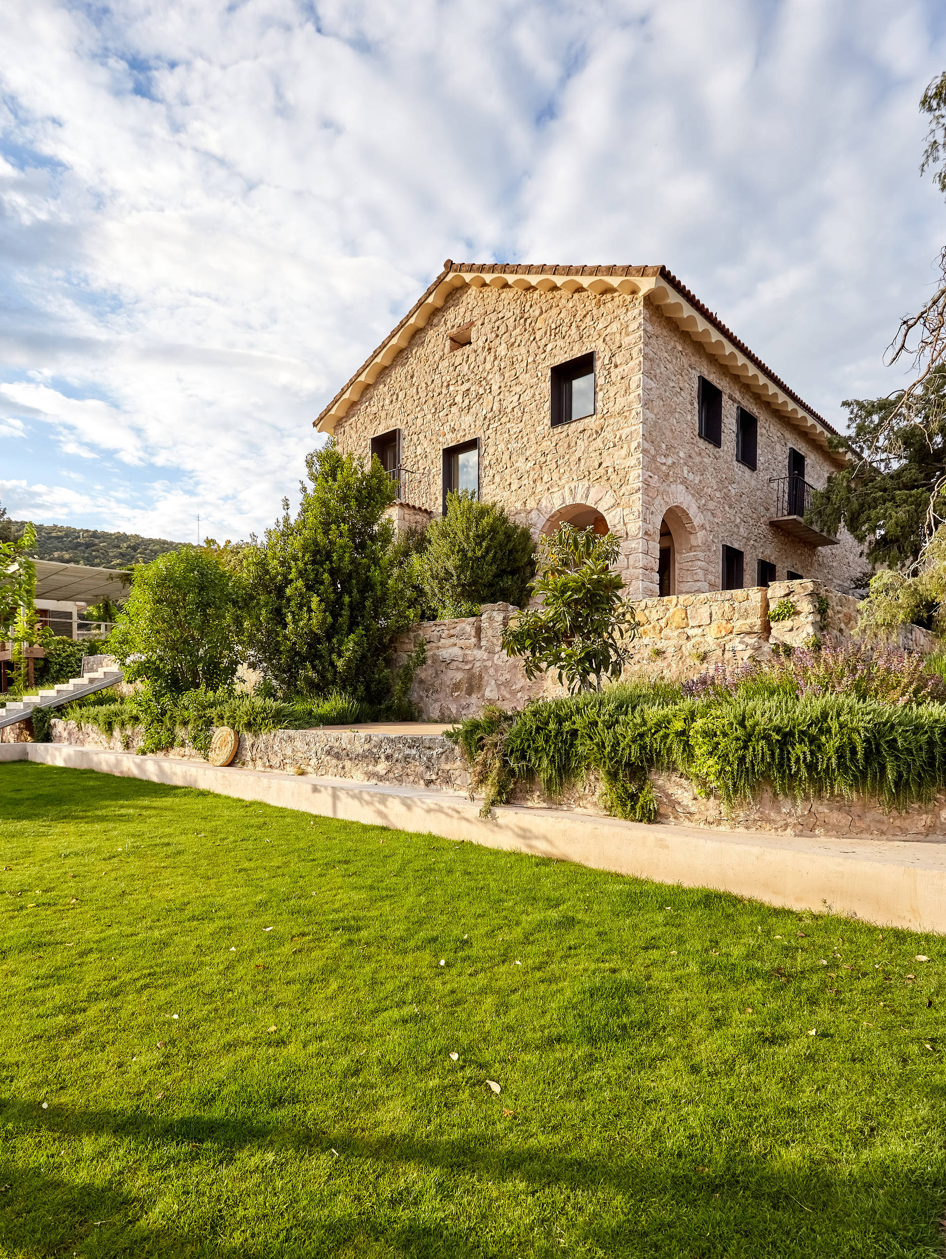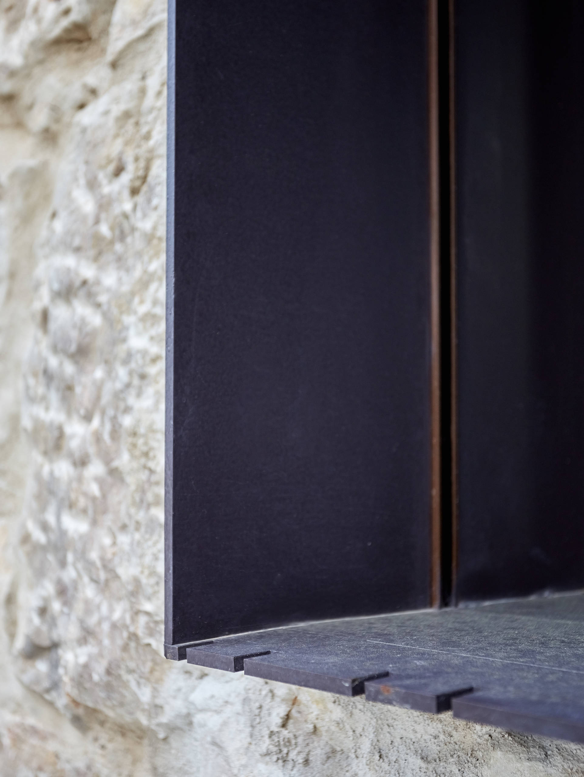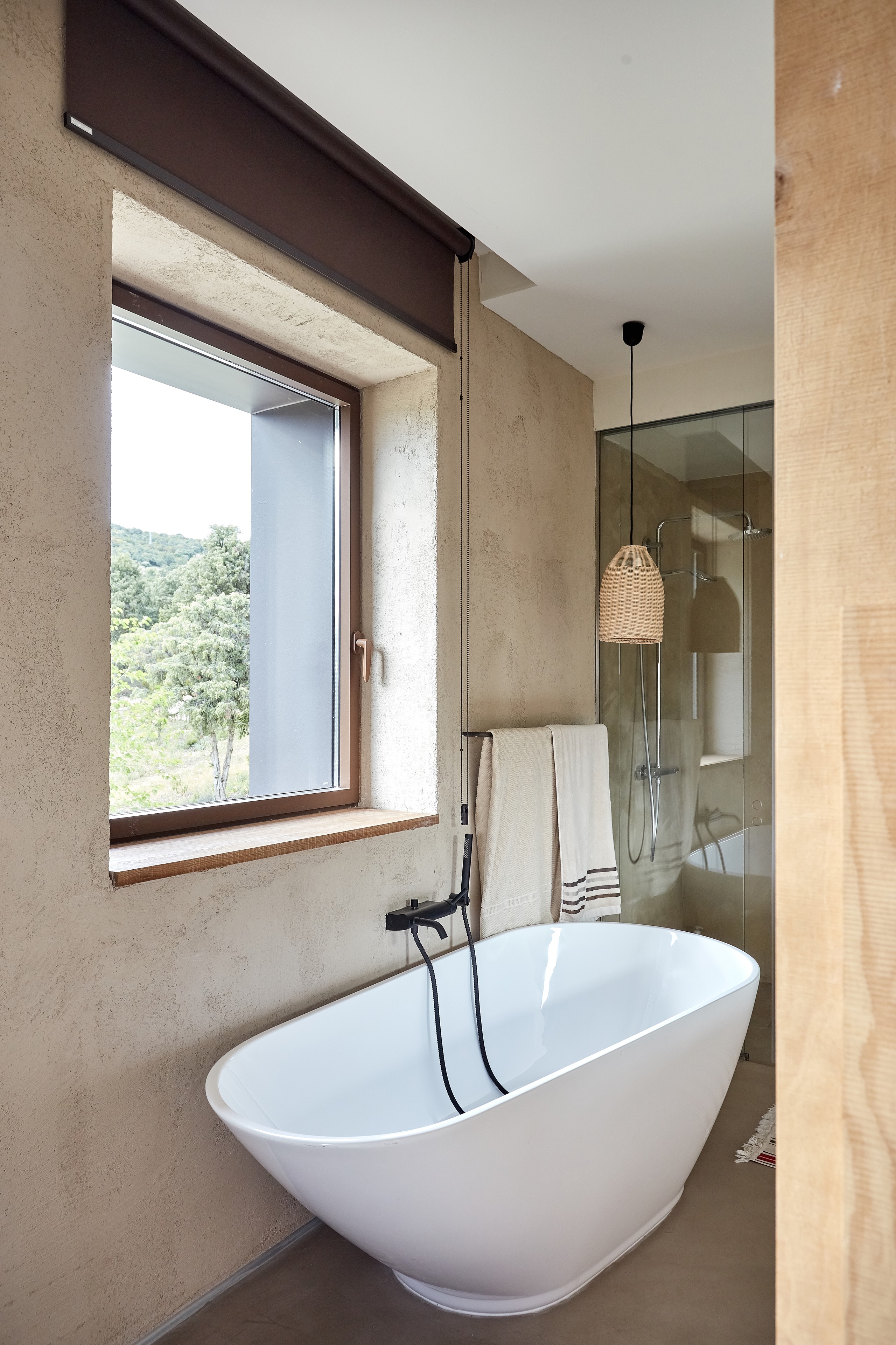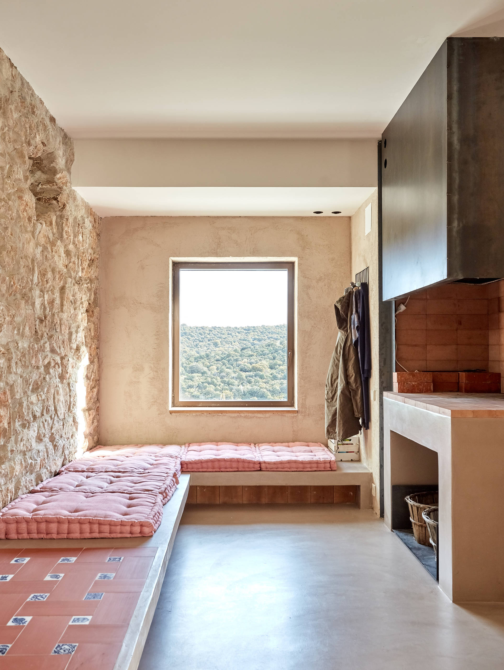 Además, el grosor de los muros de piedra (60 cm en la primera planta y 40 cm en la segunda) asegura un perfecto aislamiento. “El aislamiento está compuesto por el muro de piedra; una cámara de aire de 2 cm; 2,5 cm de aislamiento mulicapa de la marca Actis; otros 2 cm de cámara de aire; el ladrillo, de 5 cm de espesor, y el mortero coloreado en masa de la marca Dcal”, apunta el arquitecto.