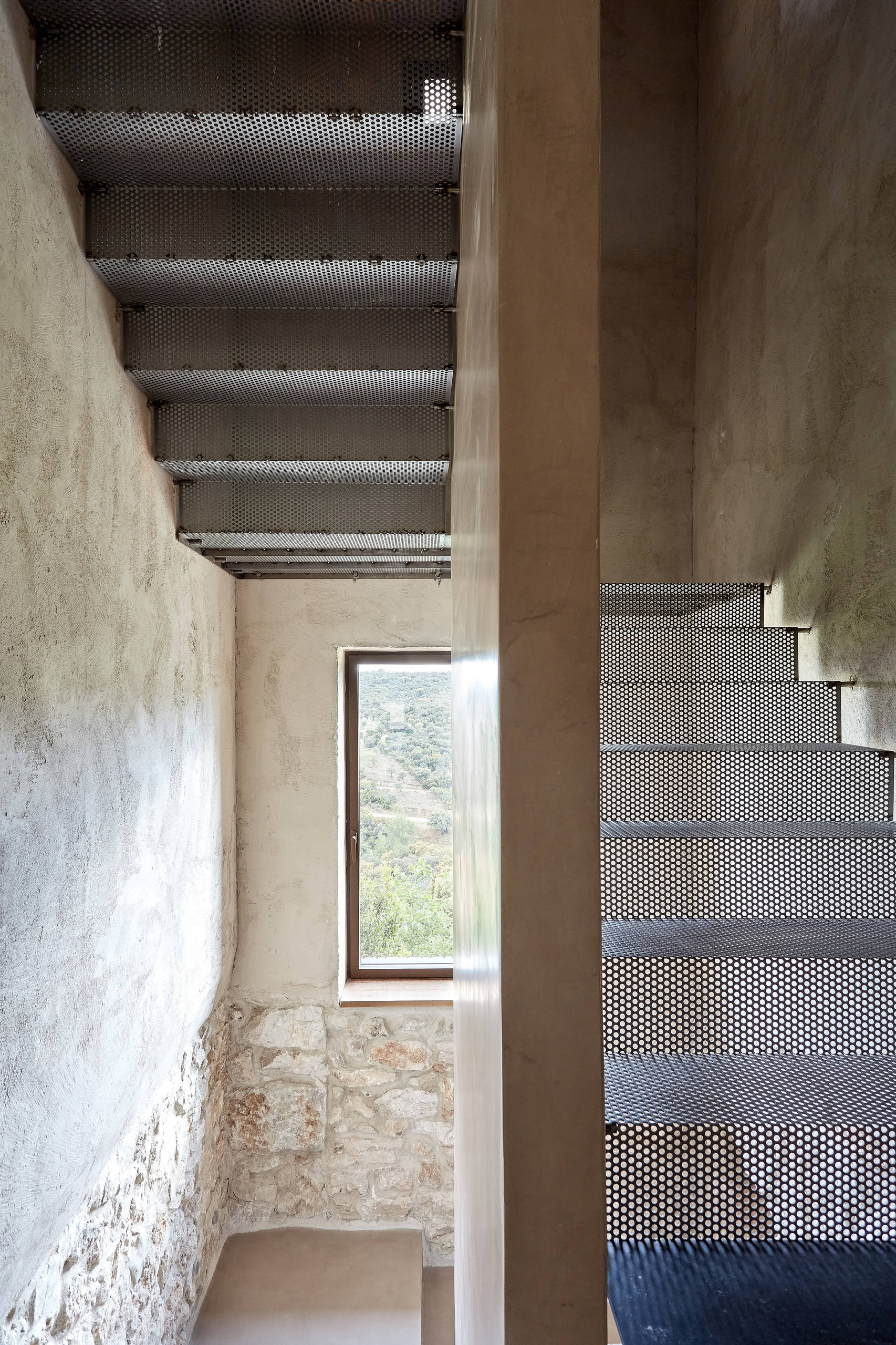 Al final del pasillo, para subir a la buhardilla, que aún está vacía, destaca la escalera de chapa de acero perforada. “Por la noche, con las luces encendidas en la primera planta, toda esta zona queda iluminada y resulta un espacio muy especial”, dice el arquitecto.