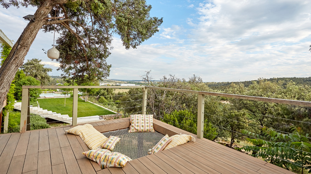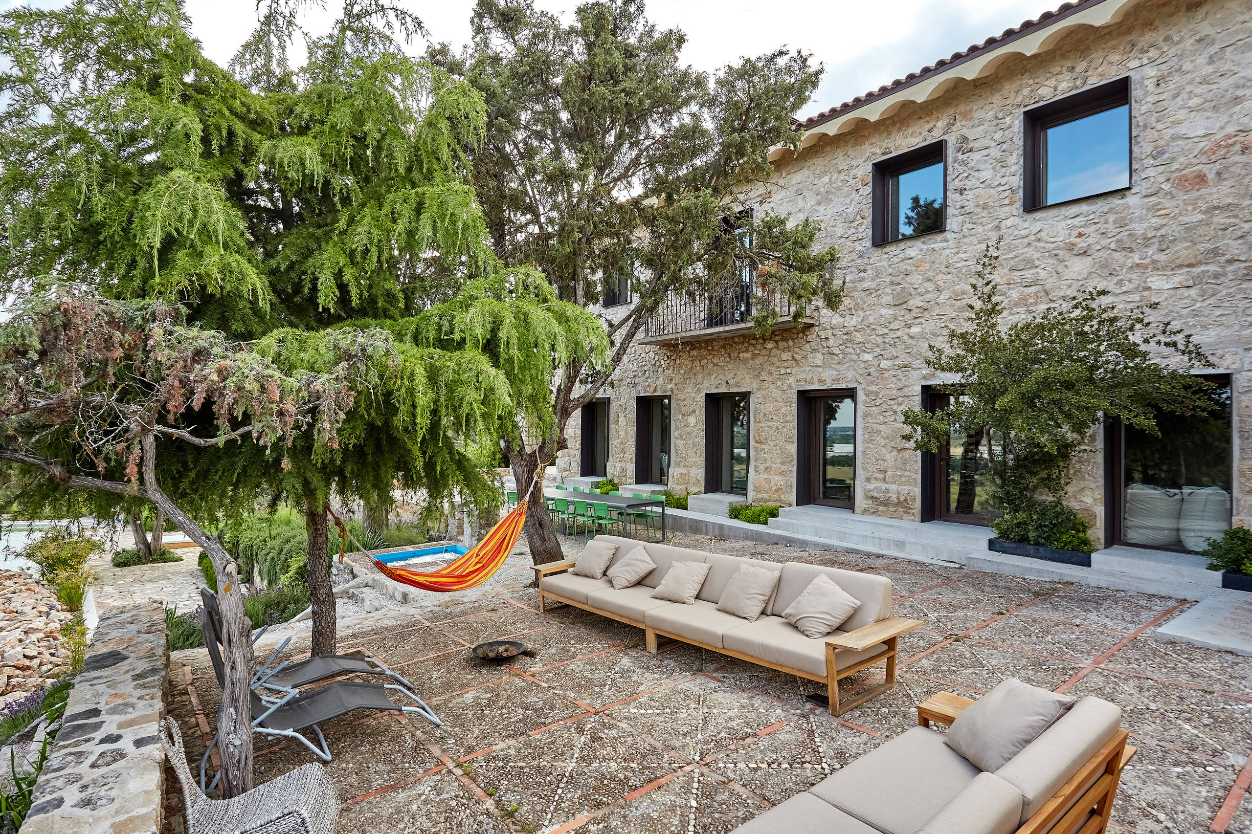 En los exteriores se descubren ambientes diferentes. El de la foto superior es un rincón bastante especial. “Se ha dejado un hueco cuadrado en la madera del suelo de la terraza y se ha cubierto con una red de catamarán fuertemente anclada sobre la que se ponen cojines. Es un lugar ideal para leer o a estar con amigos y a mis hijos adolescentes les encanta”, cuenta la dueña.