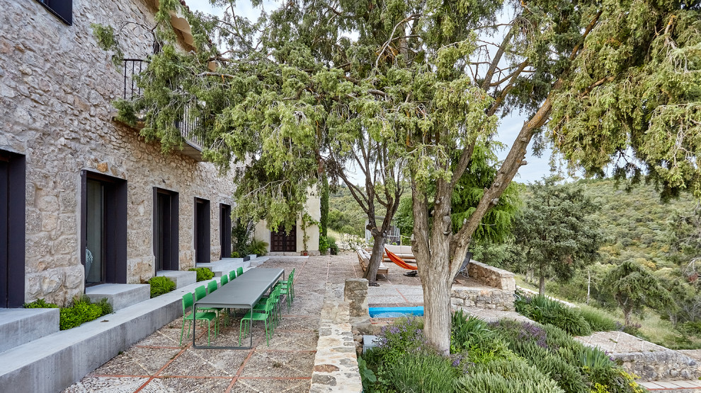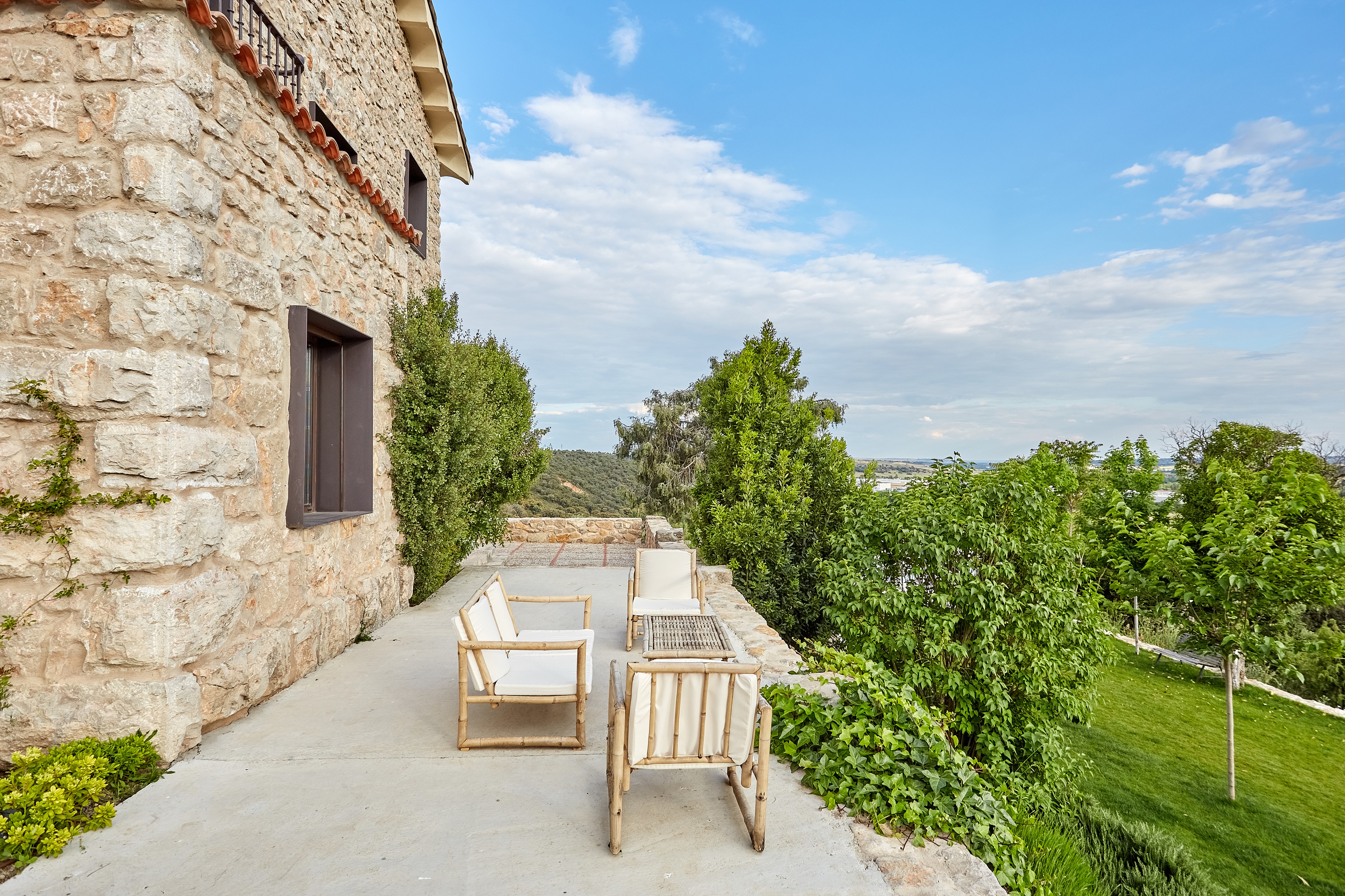 Los días de buen tiempo, los exteriores –la casa cuenta con 1.600 metros cuadrados, entre superficies aterrazadas y ajardinadas– se convierten en los protagonistas de la casa. Frente a los salones de la planta baja se ha acondicionado este espacio exterior. “Cuando refresca usamos los braseros de hierro que calientan como una fogata, incluso en invierno. Por eso, podemos aprovechar el exterior durante todo el año”, dice la dueña.