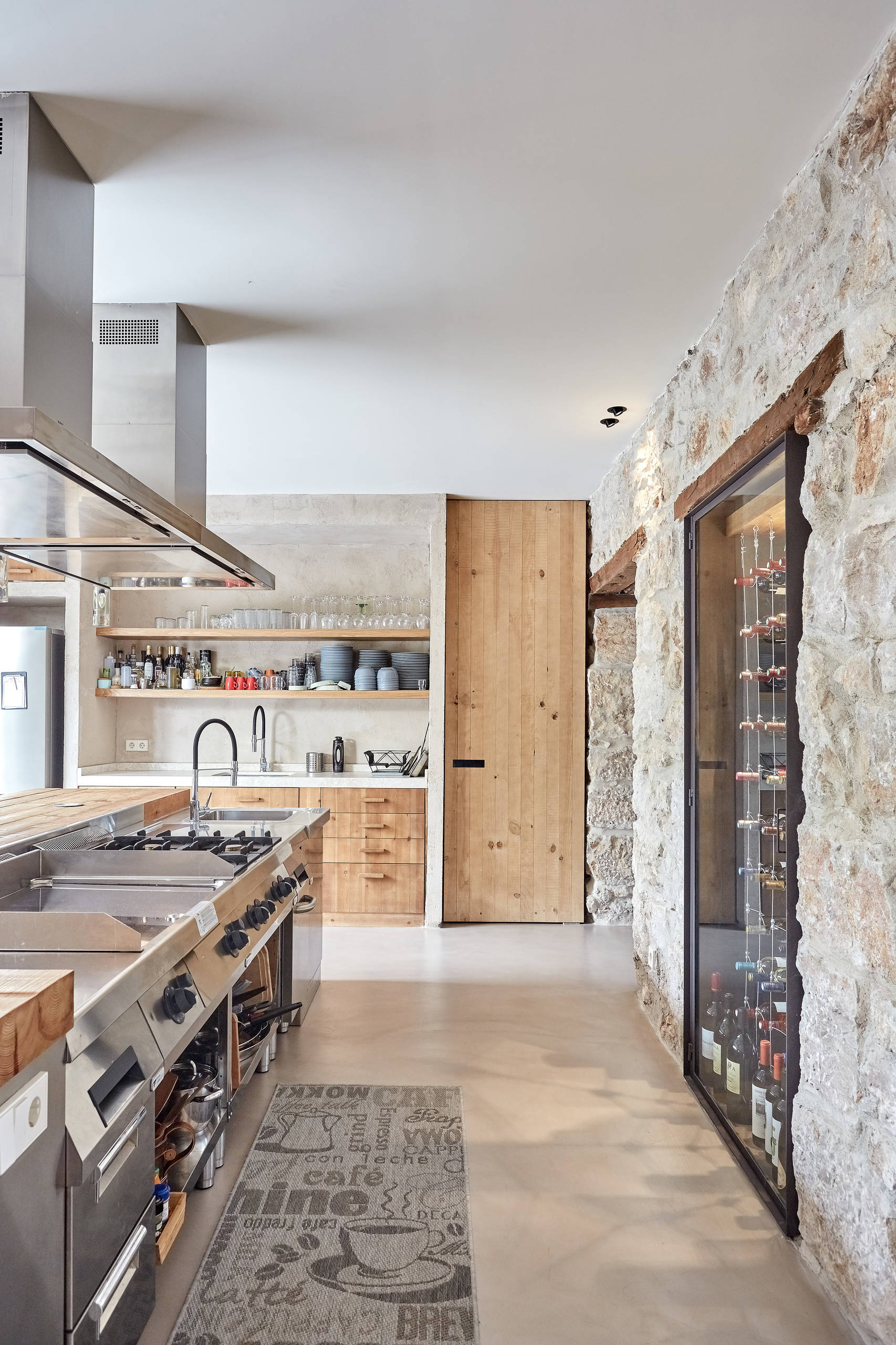 DESPUÉS: Sin duda, al llegar a la casa sorprende la bonita fachada de piedra. Los ojos se detienen en la imponente estructura de acero que enmarca la puerta principal. El contraste entre el acero y la madera resulta elegante. Tras el acceso, inundado por una ligera fragancia a aceites esenciales, madera y piedra, se abre un amplio espacio compuesto por comedor y cocina (ver siguiente imagen).