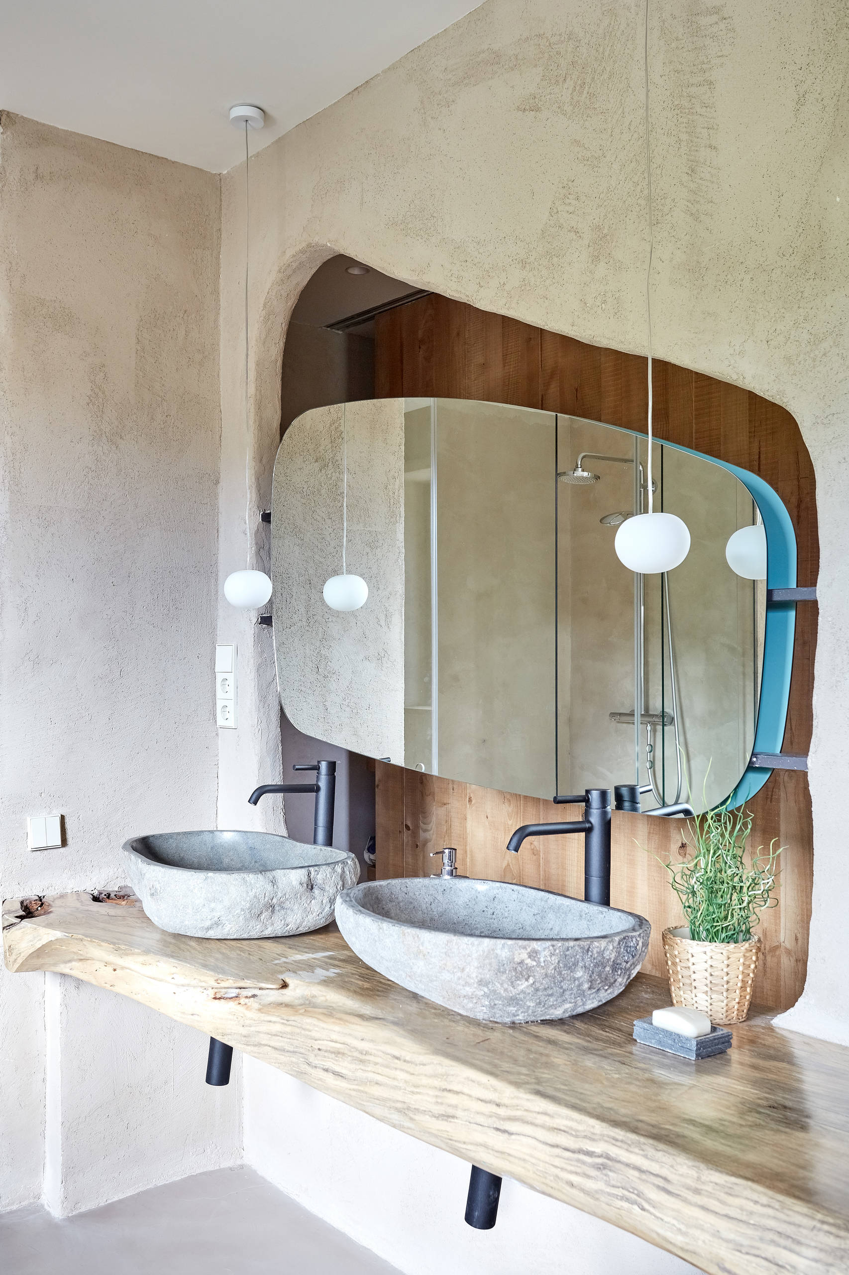 En los baños destacan elementos de Indonesia, como estos lavabos de piedra del baño del dormitorio principal. De hecho, la mayoría del mobiliario procede de Bali-lounge: empresa dedicada a la importación de artesanía balinesa, como estos lavabos de piedra de la foto, las pantallas de las lámparas o la mesa del salón de la planta baja.