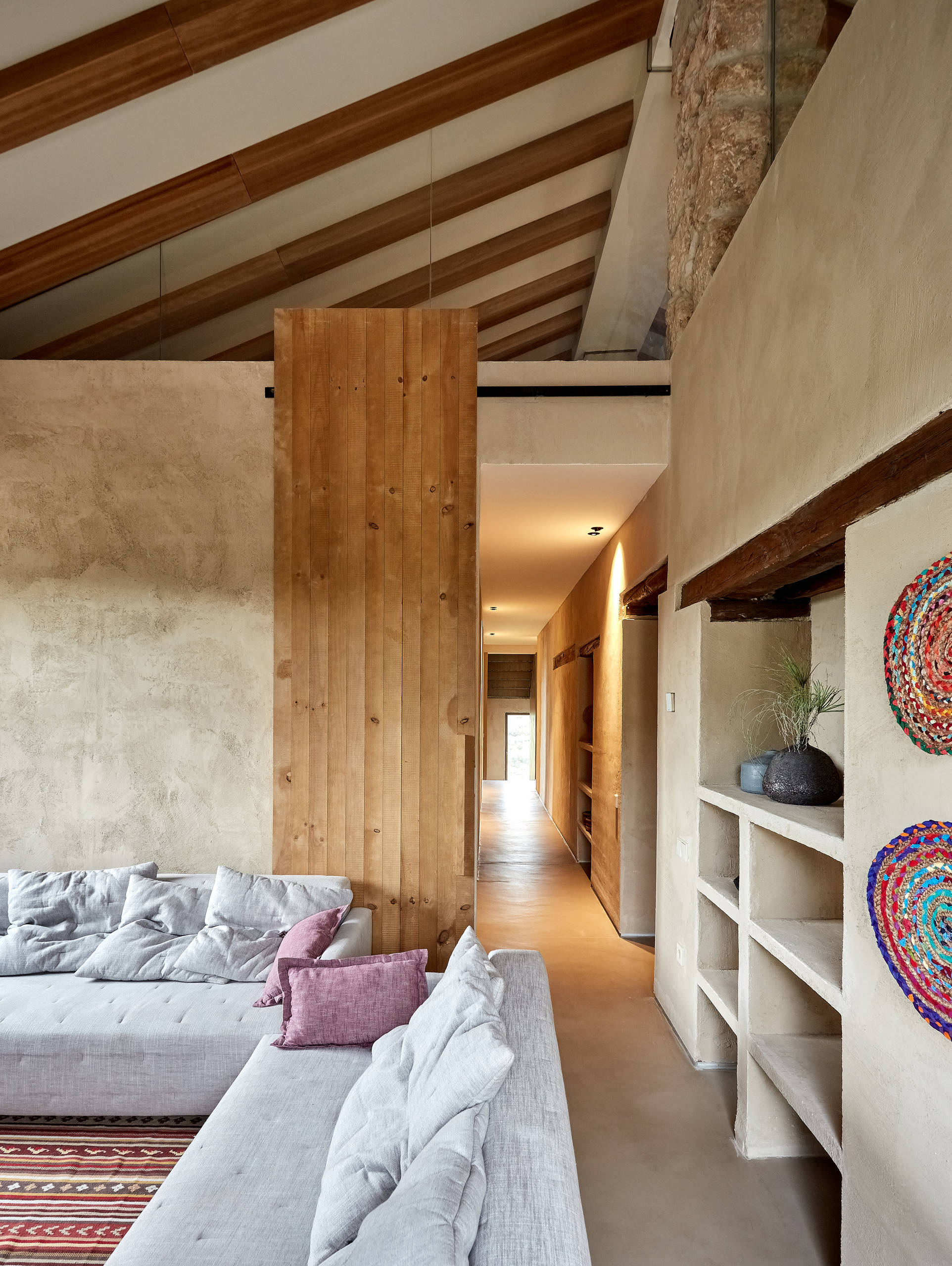 En esta imagen vemos una parte del estar y el distribuidor de la planta superior alrededor del que se encuentran las habitaciones. Una gran puerta corredera de pino cierra el estar del pasillo. Las gruesas vigas de madera se han dejado a la vista.