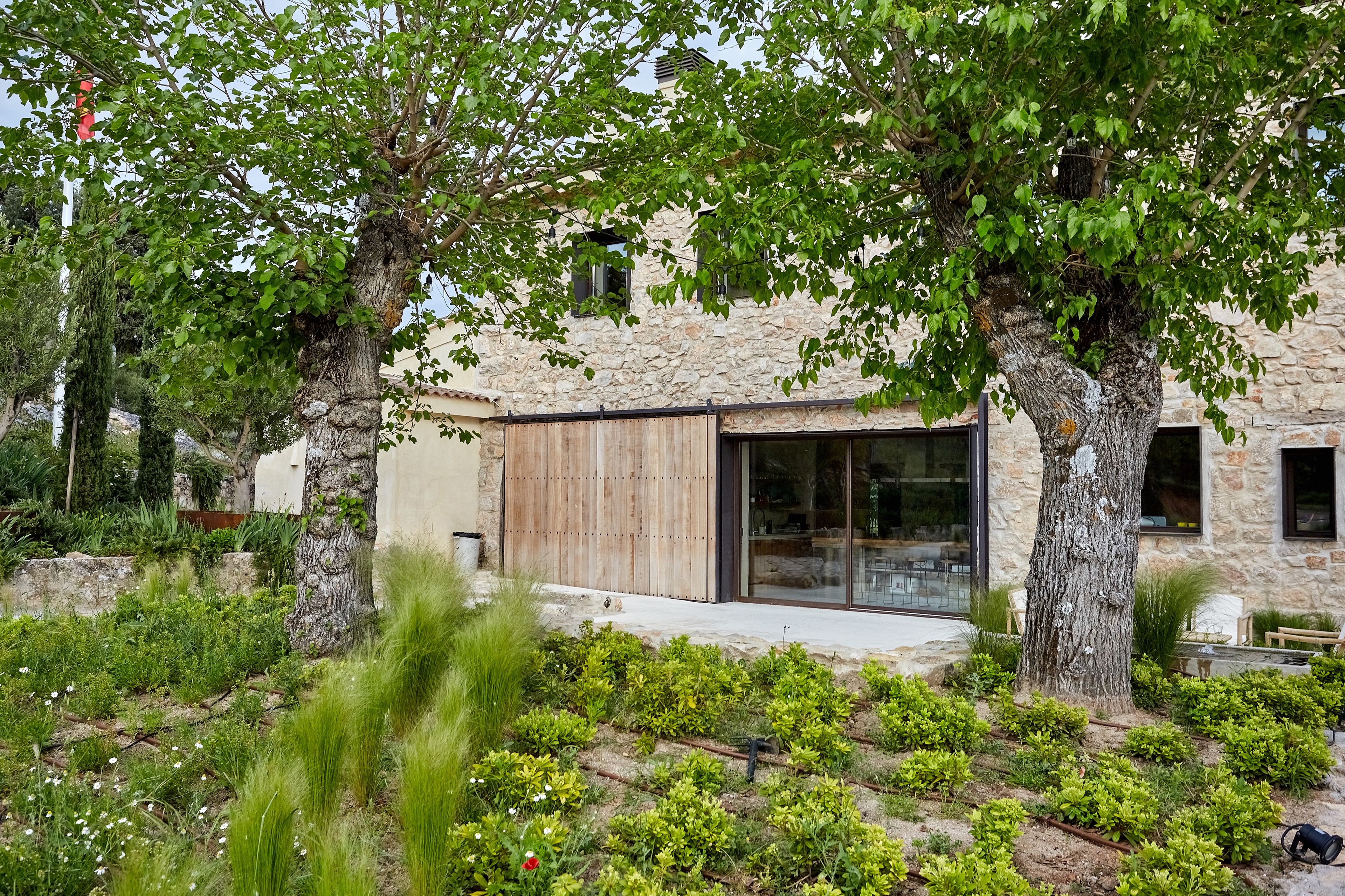 En la planta baja, por ejemplo, la isla de la cocina se abre al exterior gracias a un enorme ventanal protegido por fuera por una puerta corredera de madera maciza con marco de acero que normalmente está abierta (ver foto anterior), pero que en todo caso se puede cerrar y que actúa como capa protectora.