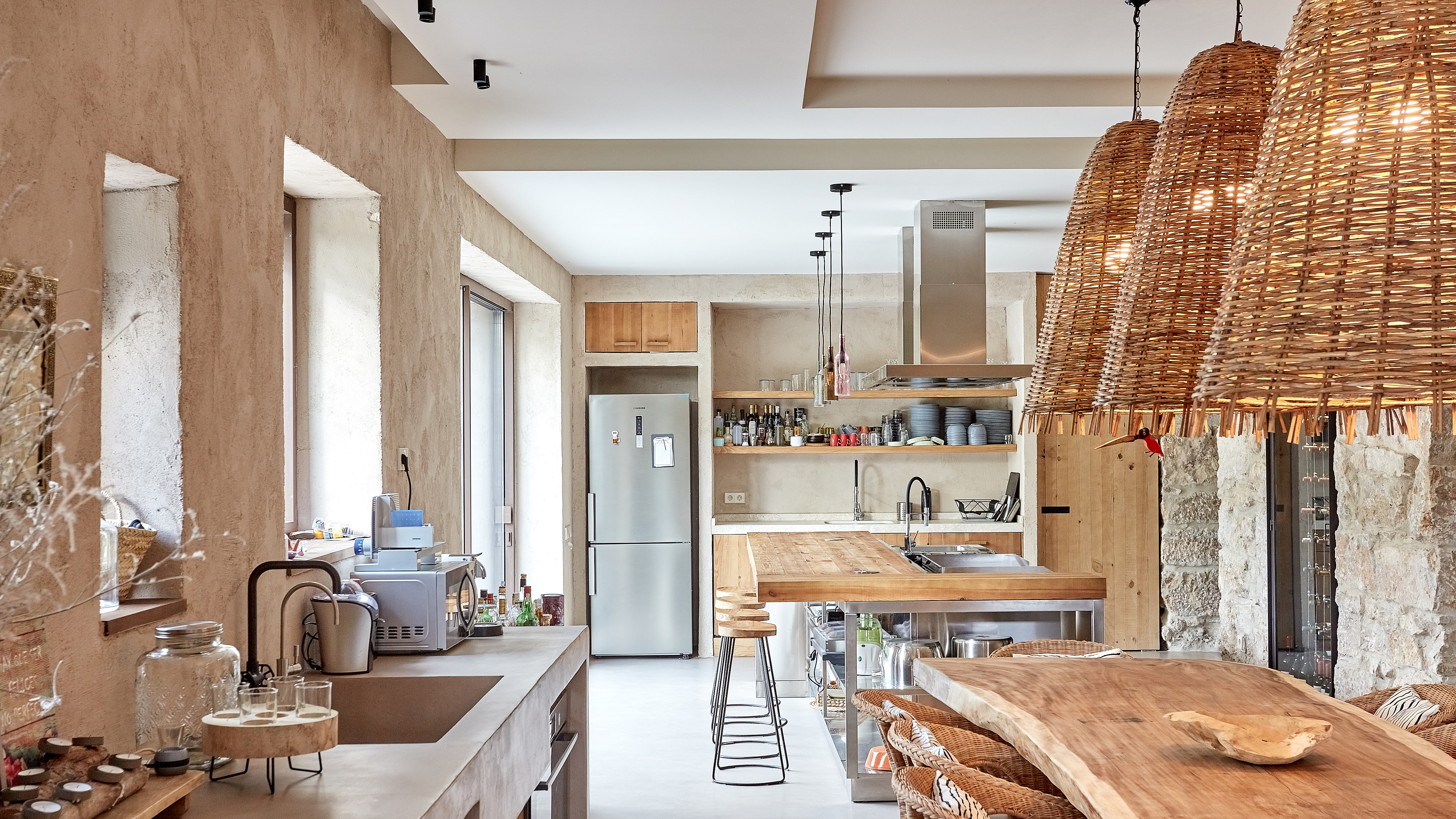El amplio comedor-cocina ocupa 57 m², un poco menos de la mitad de toda la planta baja, y es el lugar que más se usa de la casa. Aquí manda una gran mesa para 10 o 12 comensales. Sobre la mesa, unas grandes lámparas de mimbre, tejidas artesanalmente en Bali, apuntan el estilo de decoración del resto de la casa.